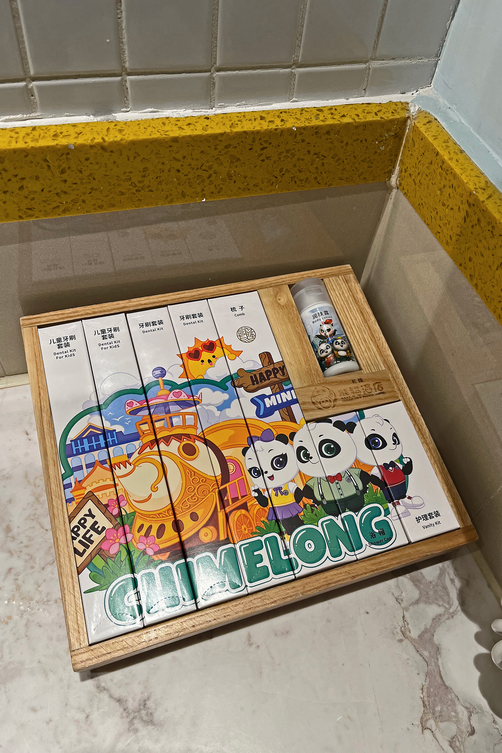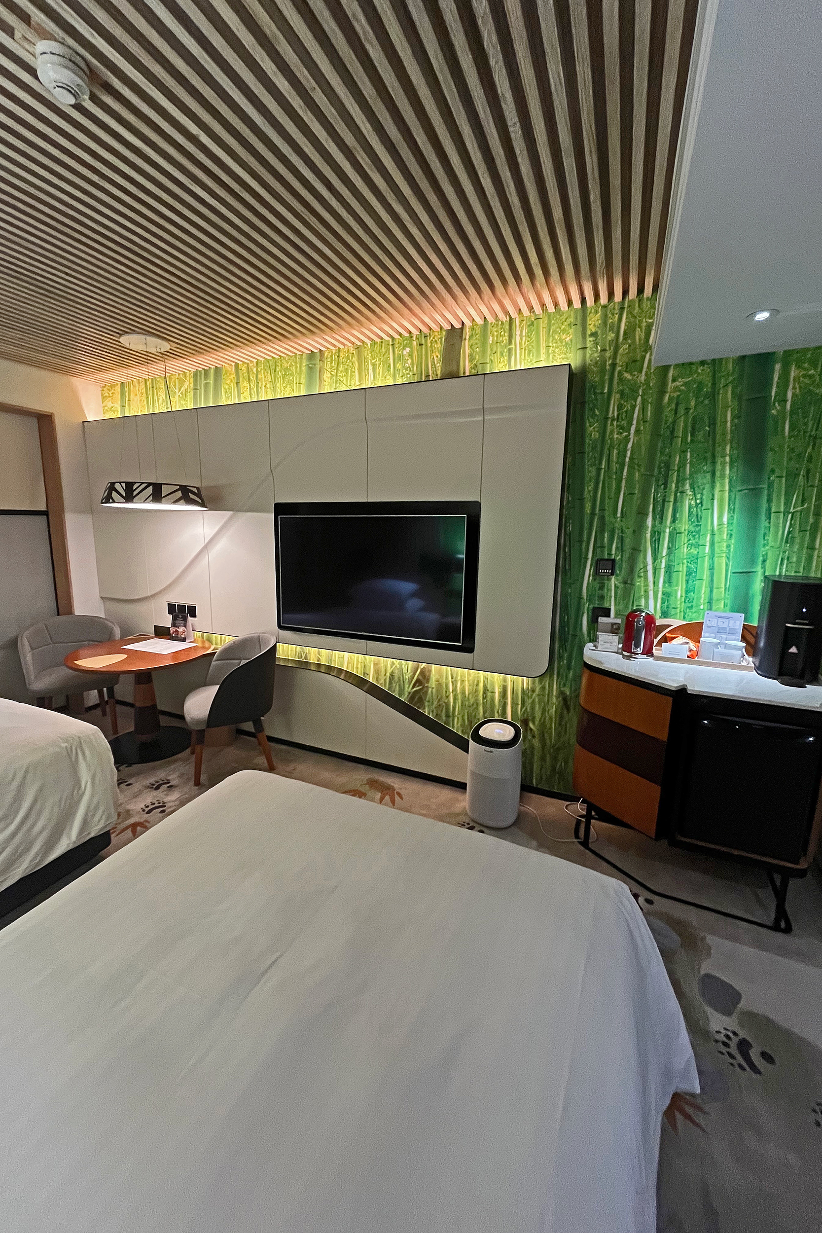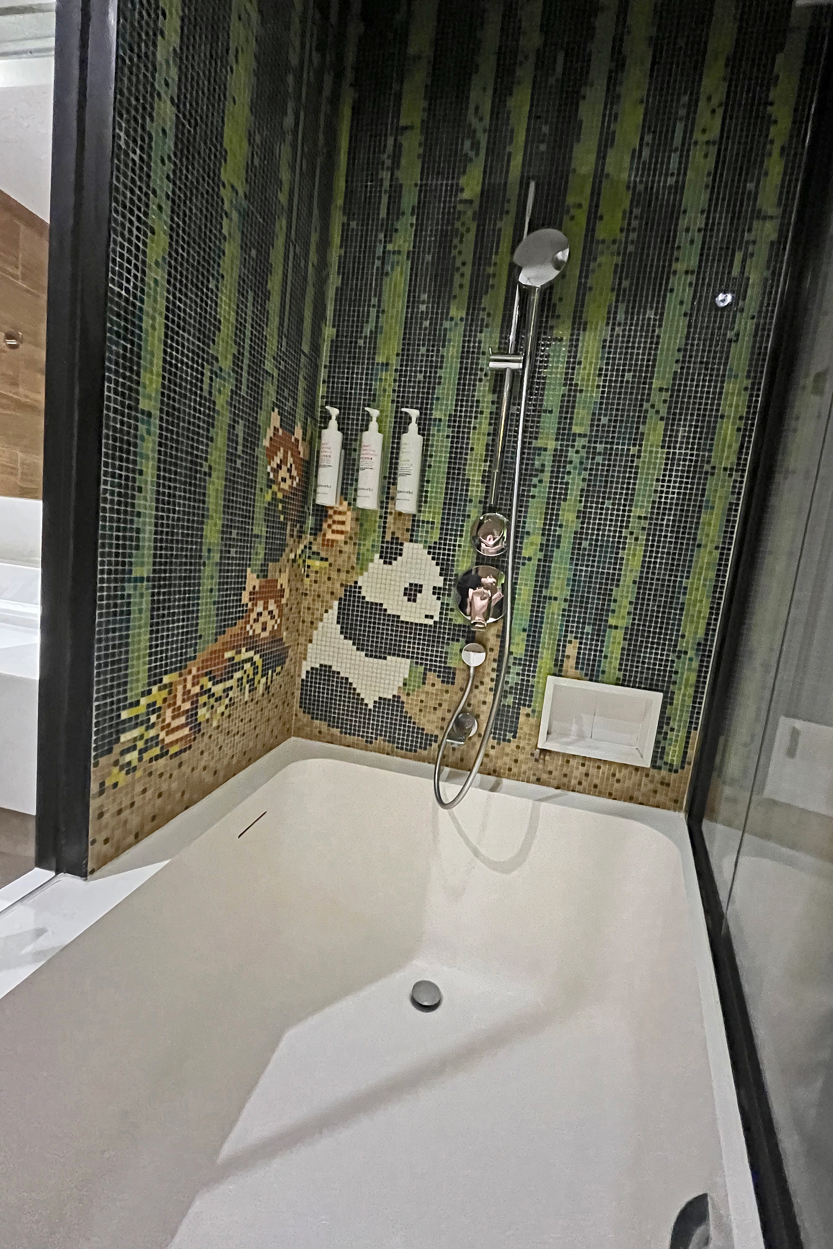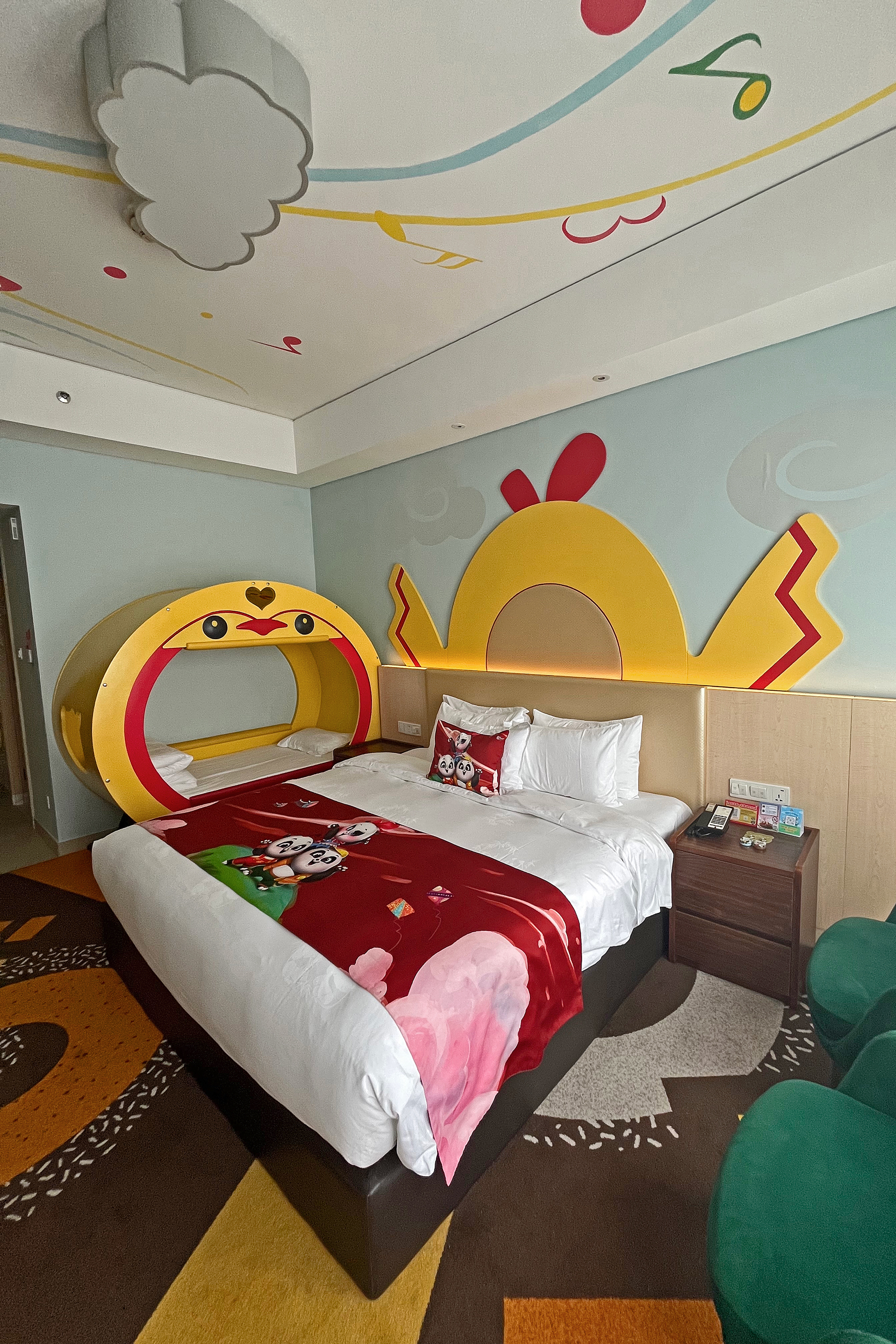 Wow wow wow – I mean I knew it would be all about pandas, but pandas are everywhere, it’s the place for me! I asked around a bit before booking, but didn’t no-one else I knew had stayed previously. I struggled to book on the official website, so made my booking through trip.com and that worked perfectly (could also check out previous reviews and guest photos there as well). There are 3 themes of rooms, which match up to the panda triplets – the rooms are categorised as ‘smart’, ‘cool’ and ‘cute’, with increasing prices across the categories, but essentially they are all the same room (and same size listed online). Originally I had booked the ‘smart’ room, the cheapest, for £108 for 1 night mid-week in February, but when I checked in I was very kindly upgraded to a ‘Prince family’ room. I am yet to understand where chickens come in to panda theming, but the room was a chicken-panda themed room XD I have noticed now there is a new category higher than this, the ‘Meizhu family’ room, which looks very adorable! From the photos online, the family rooms just have an extra bed/bunk bed in addition to the king bed, and twin rooms are also available. Bathrooms all look to be the same but with different colour theming.
