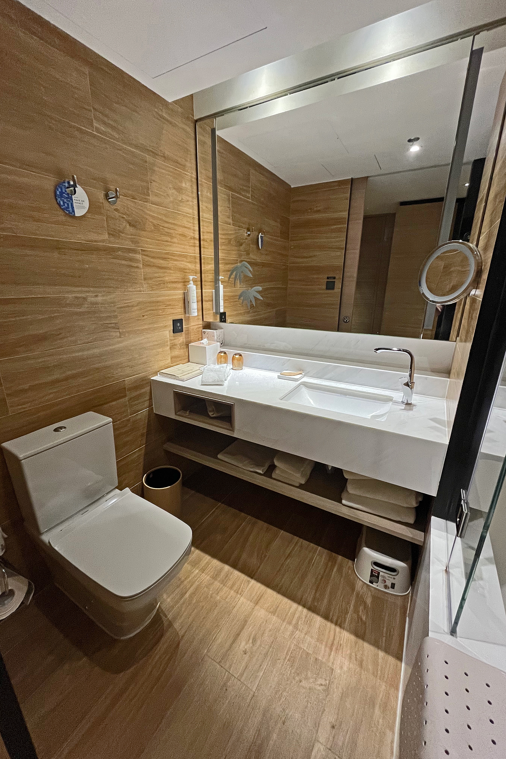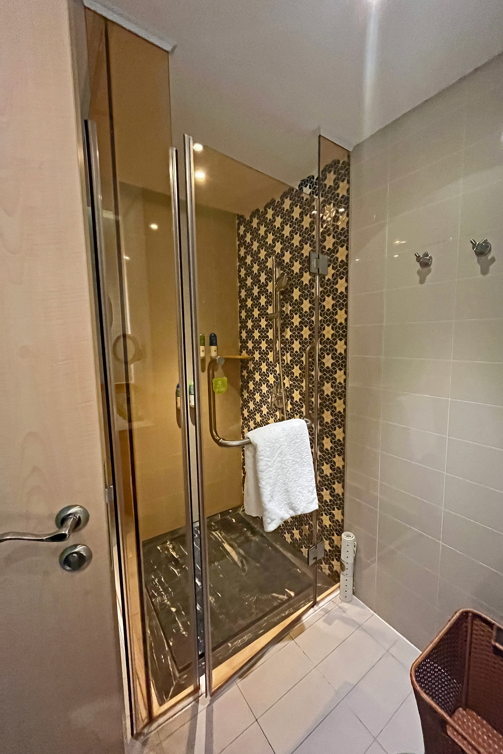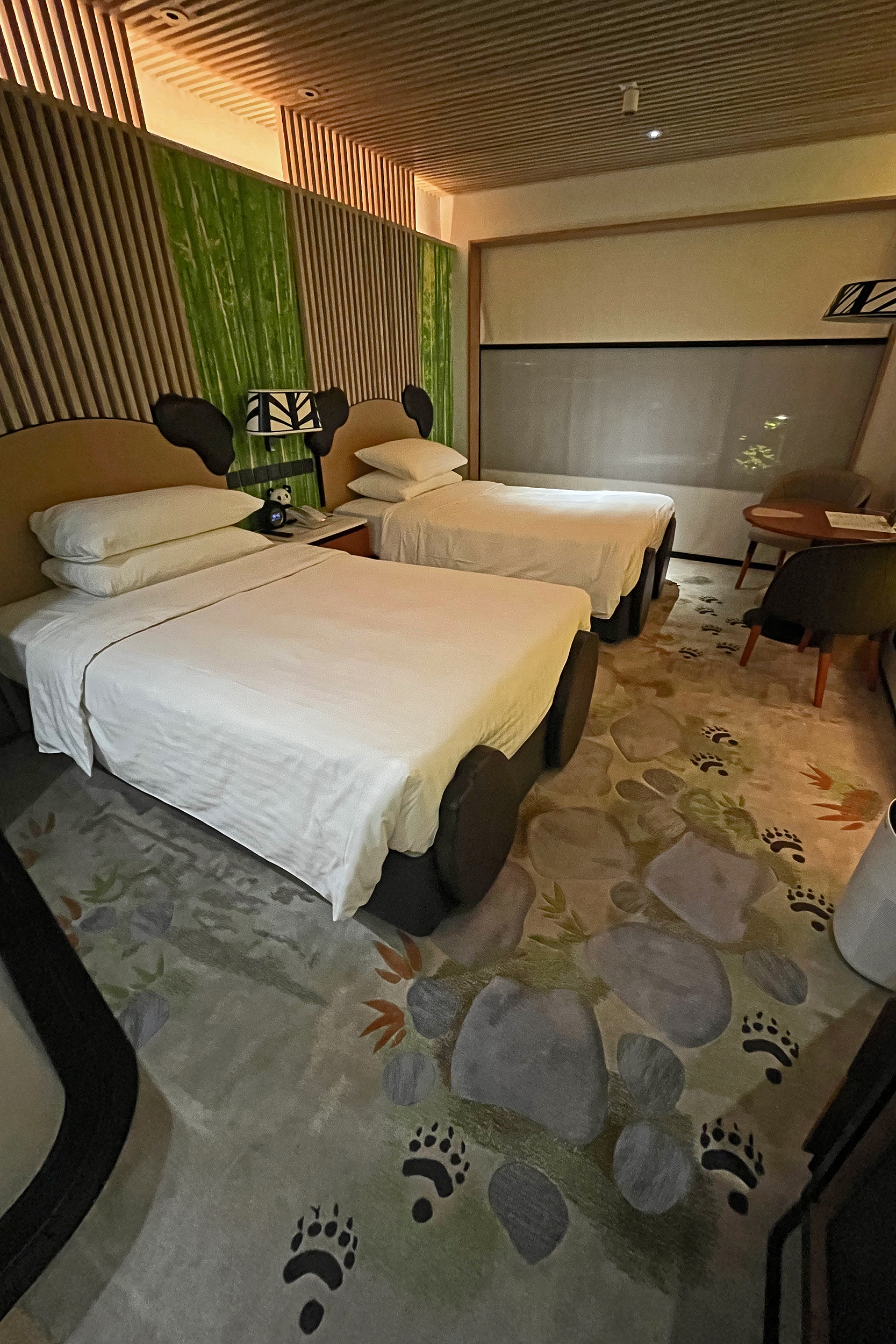 The panda themed room is amazing, I would completely recommend this for a panda fan (or for a family who likes something a little bit extra). Whereas the Chimelong Panda Hotel does generally seem a little more geared towards families, the Ocean Park Marriott is definitely not restricted to that and the style is suited to adults as well. When I walked in the room the first thing I saw was the carpet with the nature style design and panda paw prints, absolutely adorable (and was super soft). I really liked the wood panelling, the bamboo design on the wall and all the more subtle design touches. While the bedding didn’t have pandas on it, the beds themselves were pandas, this was so sweet and I loved this a lot. Plus it was a comfy bed, I had a great nights sleep here. I don’t remember the size of the beds, in the photo they look like singles, but I think they were larger than a standard single. For me the stand out design element was the bathroom tiling – in the bath/shower the wall that isn’t glass has a beautiful tiled bamboo, giant panda and red panda design, this is such a fantastic idea and really makes the room as a whole stand out. The room and bathroom as a whole were very stylish panda and also modern. The view from the room was over towards the main road and metro station, the windows were very well insulated and I didn’t hear any noise at all (nor from any neighbours either, a great plus!) – for all the time I spent in the room, I’d say 75% of it was sleeping, so a special view wasn’t particularly important to me.