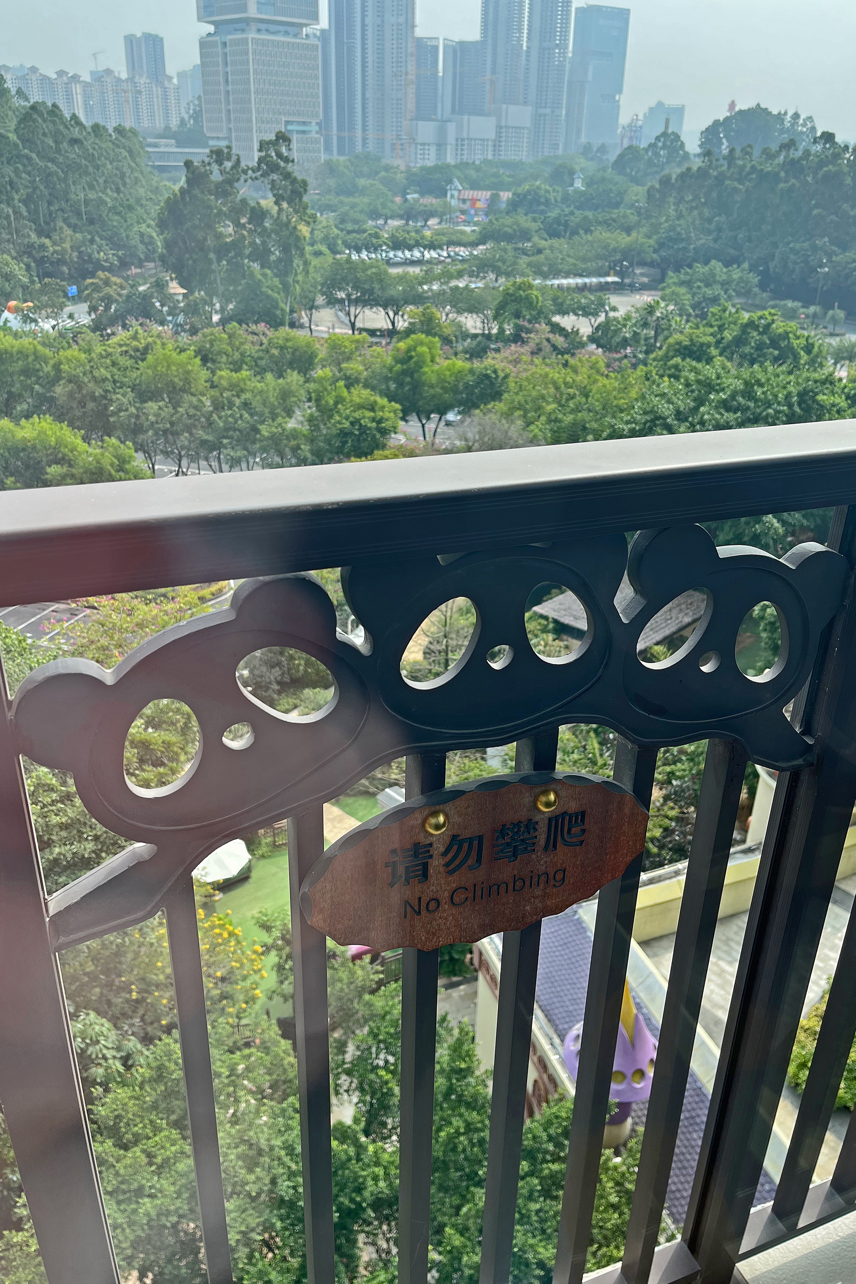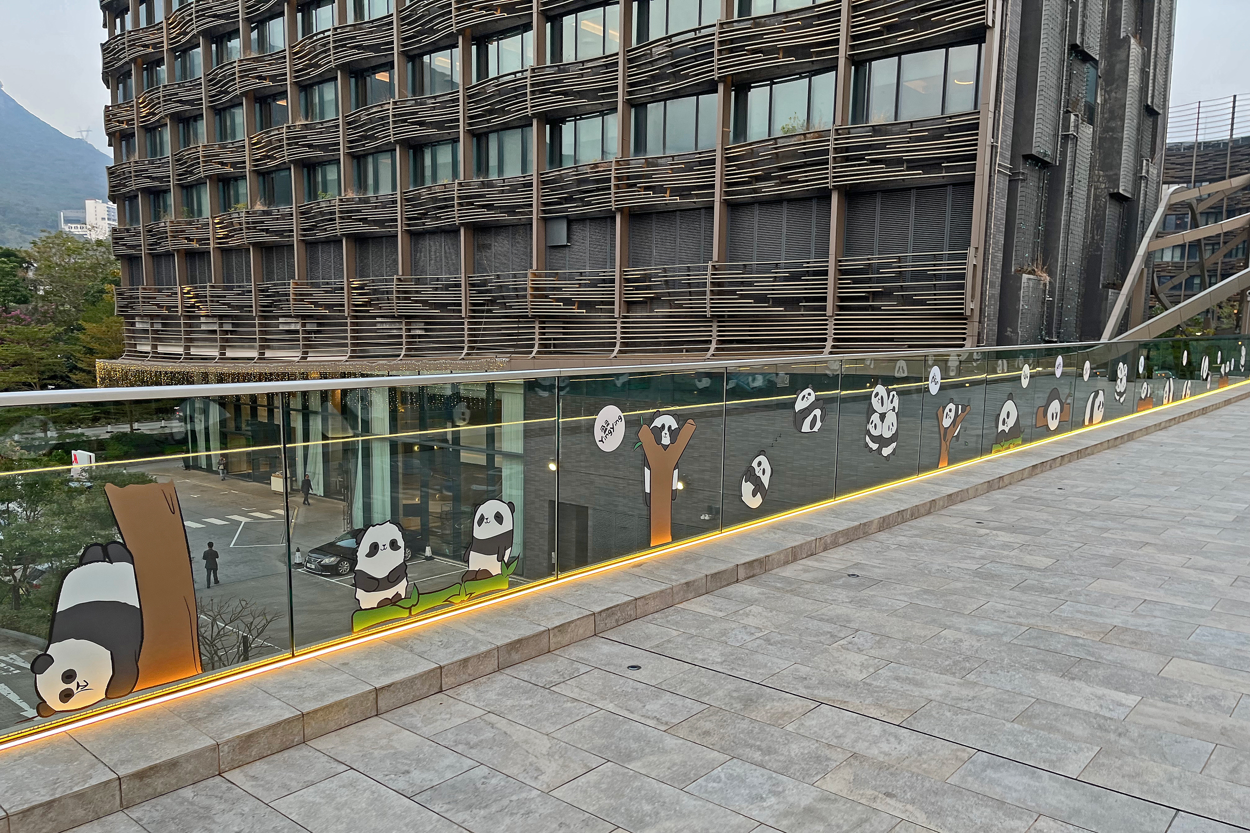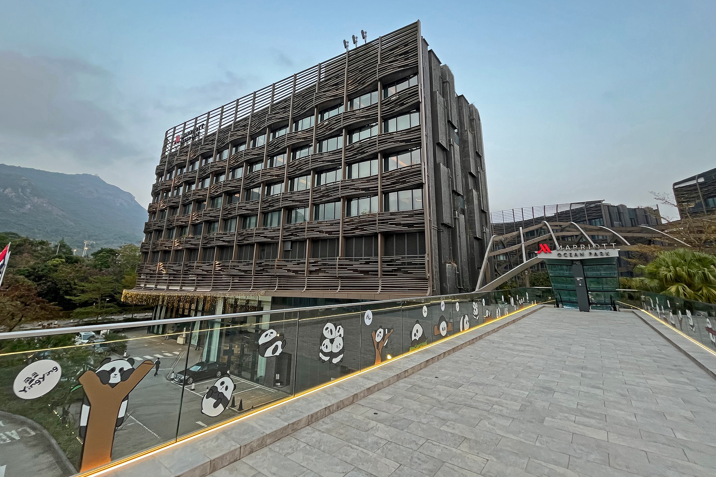 So the Ocean Park Marriott isn’t entirely panda themed, but they do have several themed rooms you can choose to book, including a panda one! Since the twins were born and the new pair of adult pandas arrived, there is also a lot of cute advertising en-route to the hotel as well, I adore these cutie designs and think they’re the perfect touch for the glass railings on the way to the hotel. They’re also all over the railings on the way out of the metro station. I think the perfect welcome to the hotel. It was just a few minutes walk from the metro station to the hotel across the elevated walkways, just follow the signs for Ocean Park and you really can’t miss it.