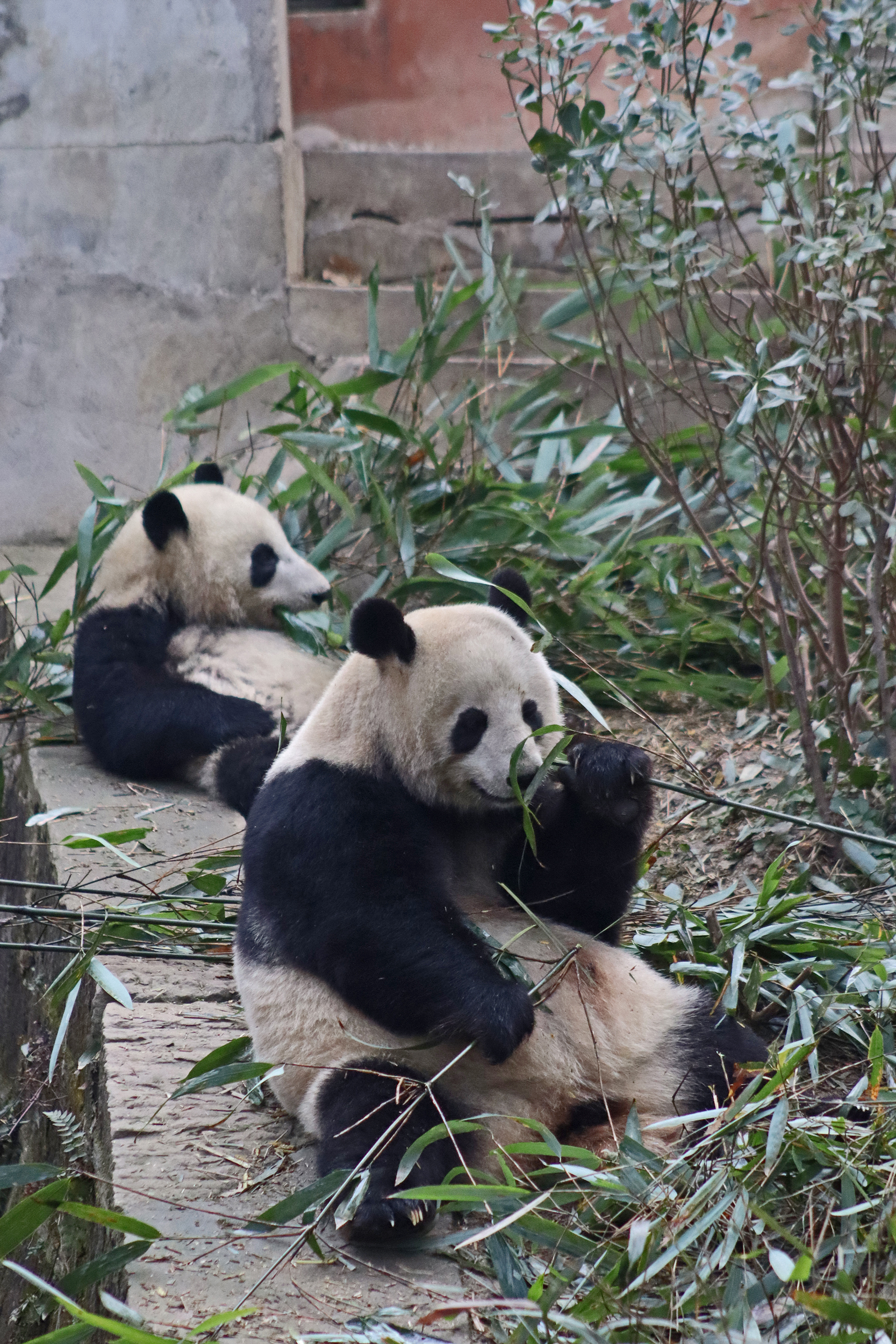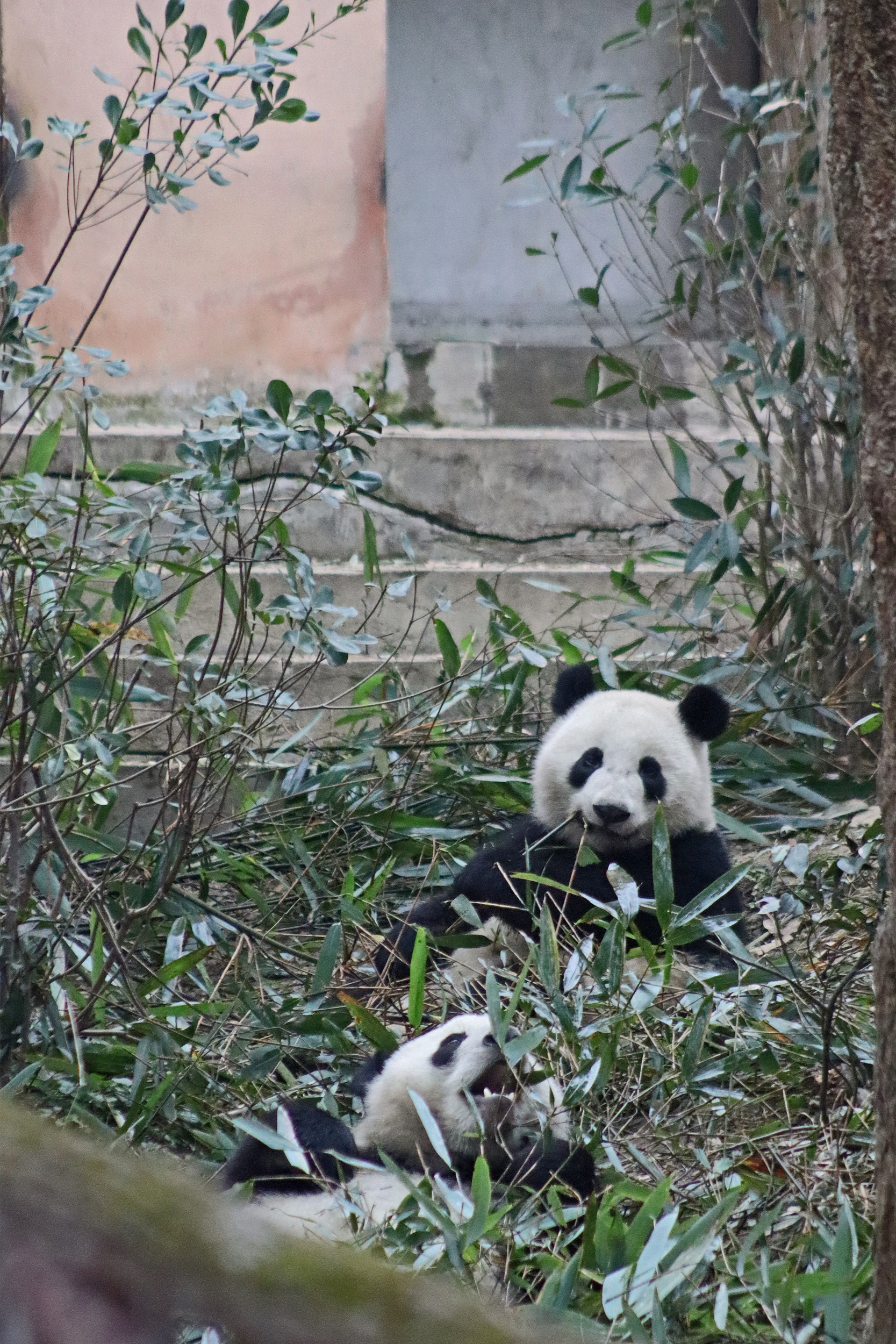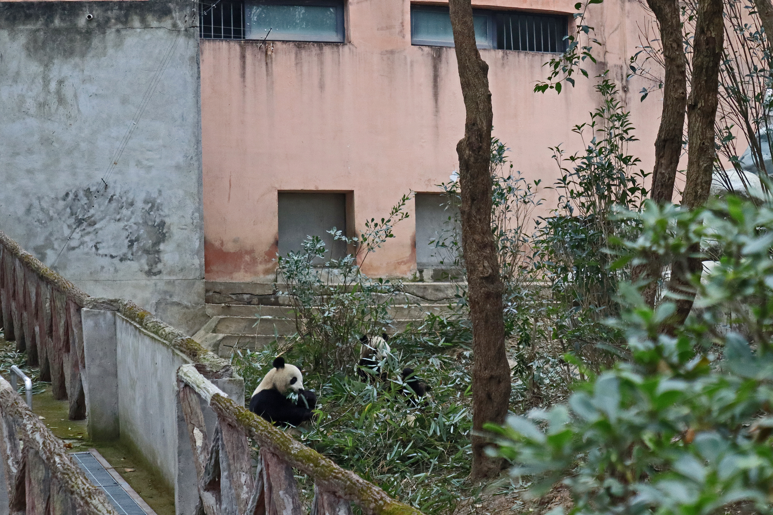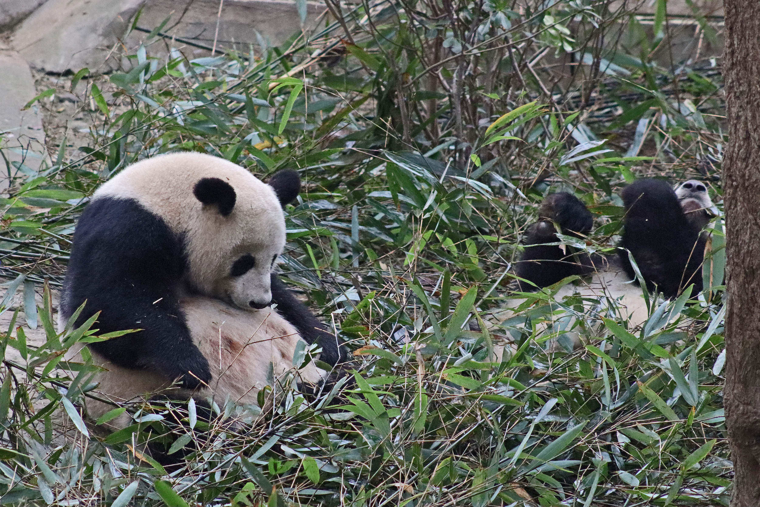 The final pandas to share about from the No1 House – and they were my first youngsters of Chengdu Panda Base on this visit, it’s Xiao Ya Tou 小丫头 and her 2023-born twins! Since my visit the cubs have now been announced as named CC and 99 … not sure how much I get that, but I guess there’s good reasoning behind it! When I was there there was only a sign for Xiao Ya Tou, you wouldn’t know there were her cubs in with her unless you saw them – and it’s a big yard with lots of plant coverage so they could easily hide away out of sight. Now, however, there is new signage so visitors know there are 3 pandas living there.