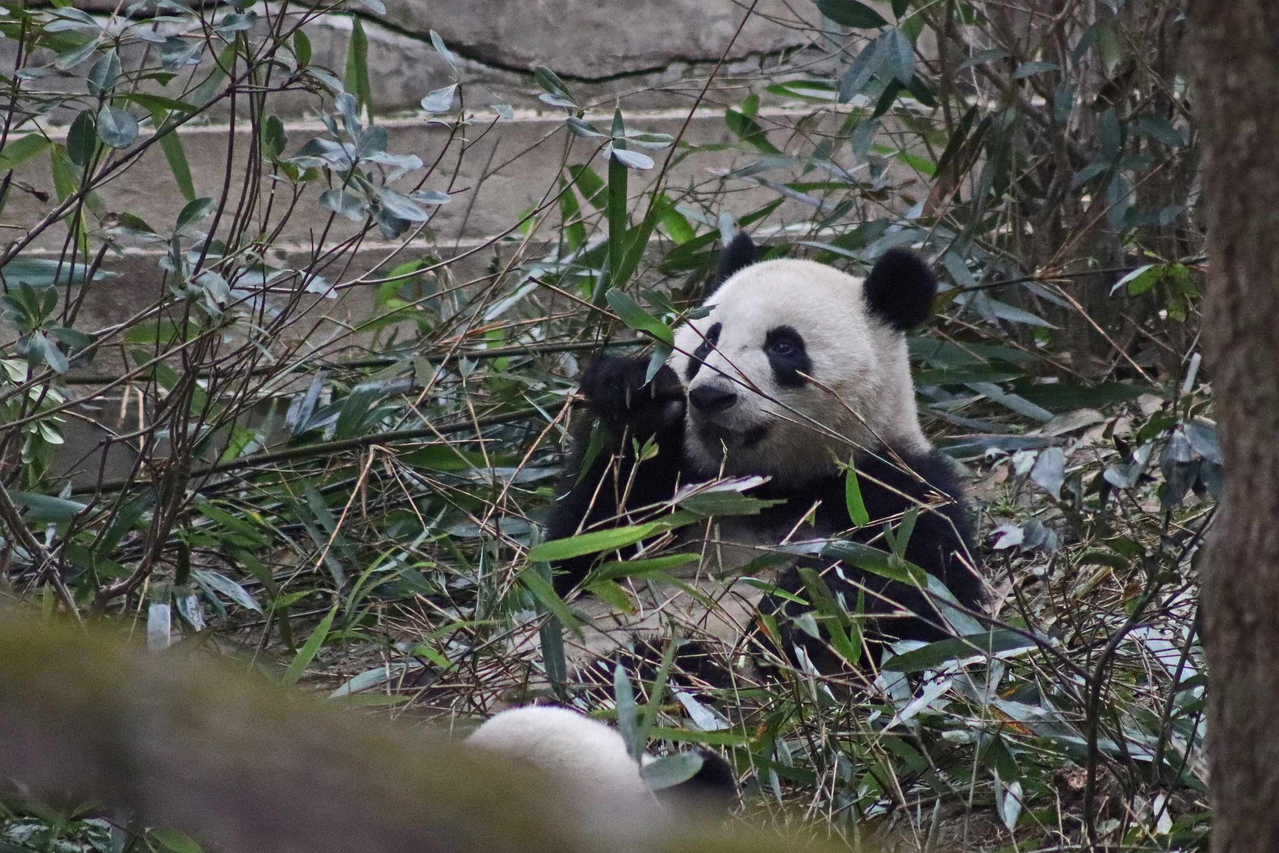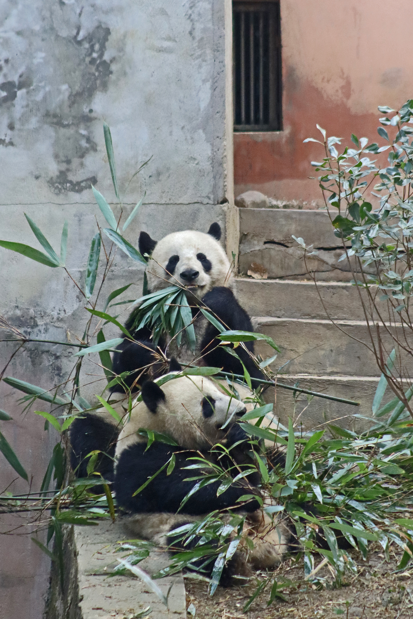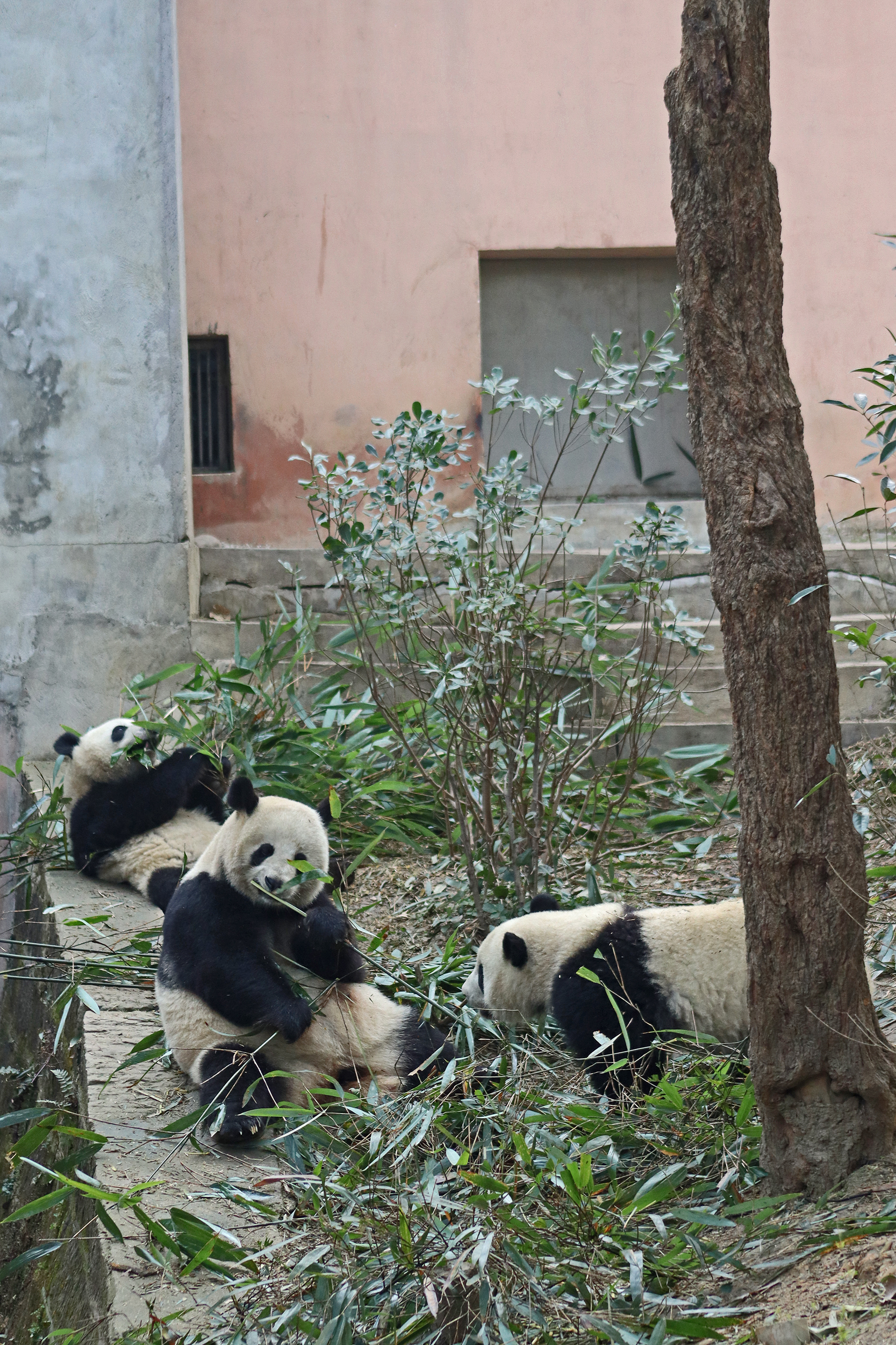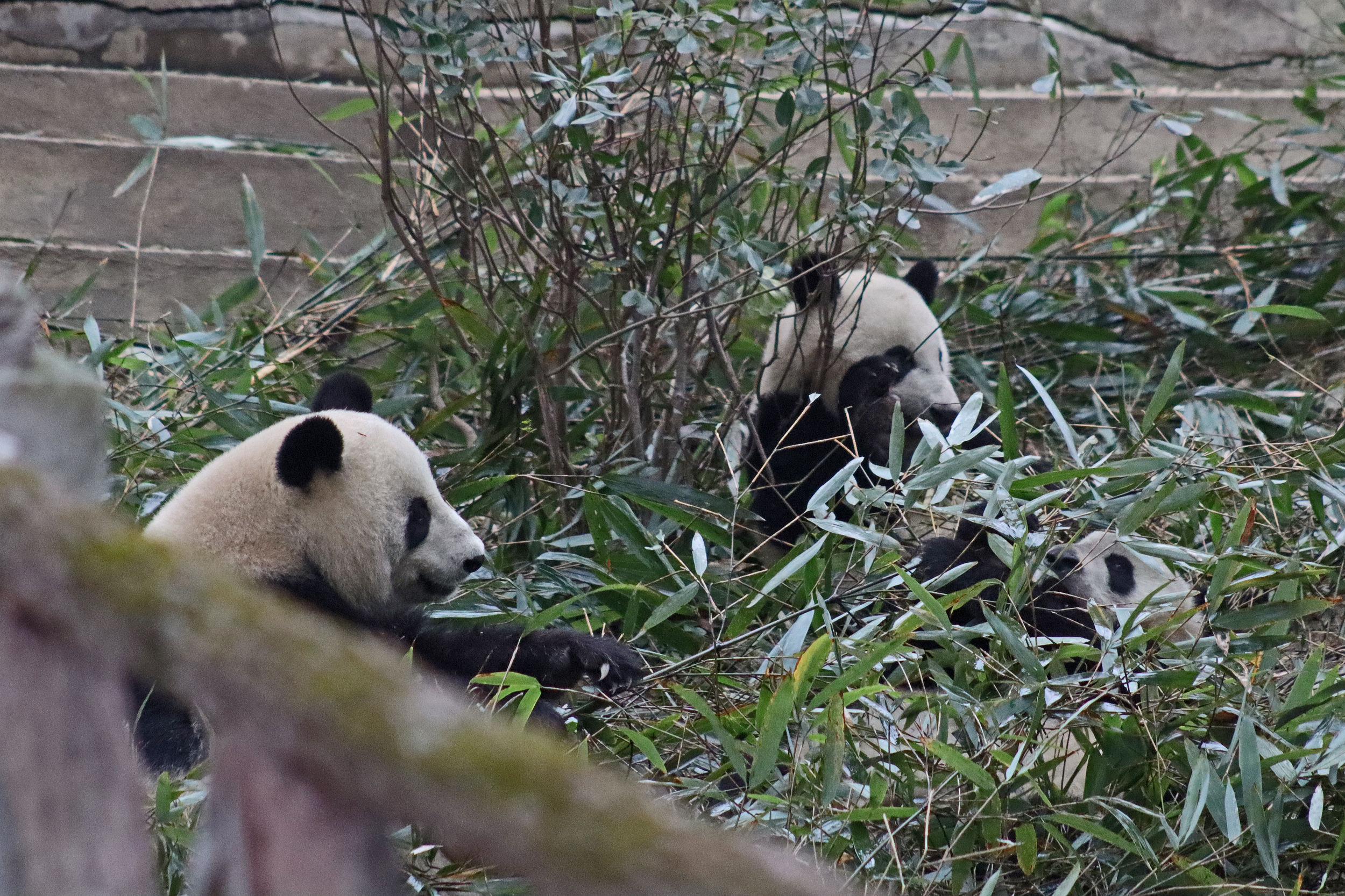 The final pandas to share about from the No1 House – and they were my first youngsters of Chengdu Panda Base on this visit, it’s Xiao Ya Tou 小丫头 and her 2023-born twins! Since my visit the cubs have now been announced as named CC and 99 … not sure how much I get that, but I guess there’s good reasoning behind it! When I was there there was only a sign for Xiao Ya Tou, you wouldn’t know there were her cubs in with her unless you saw them – and it’s a big yard with lots of plant coverage so they could easily hide away out of sight. Now, however, there is new signage so visitors know there are 3 pandas living there.