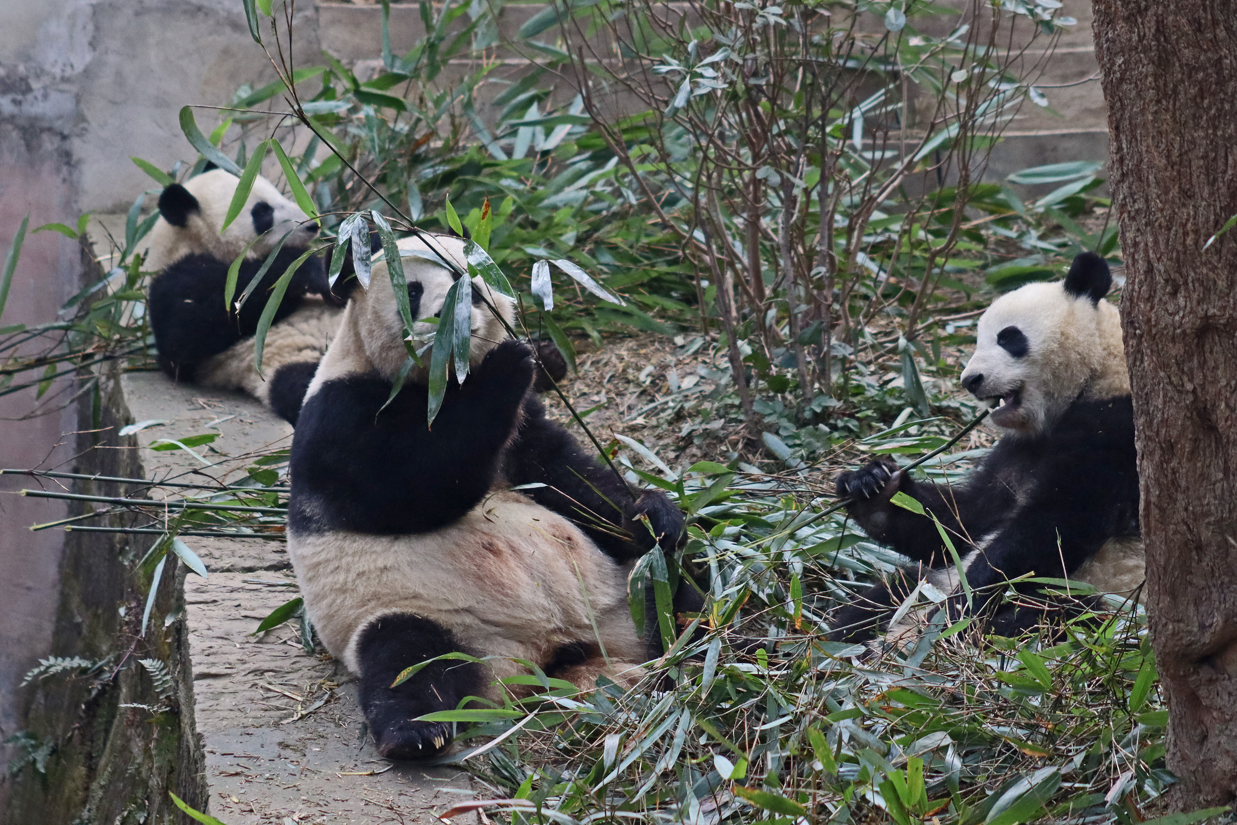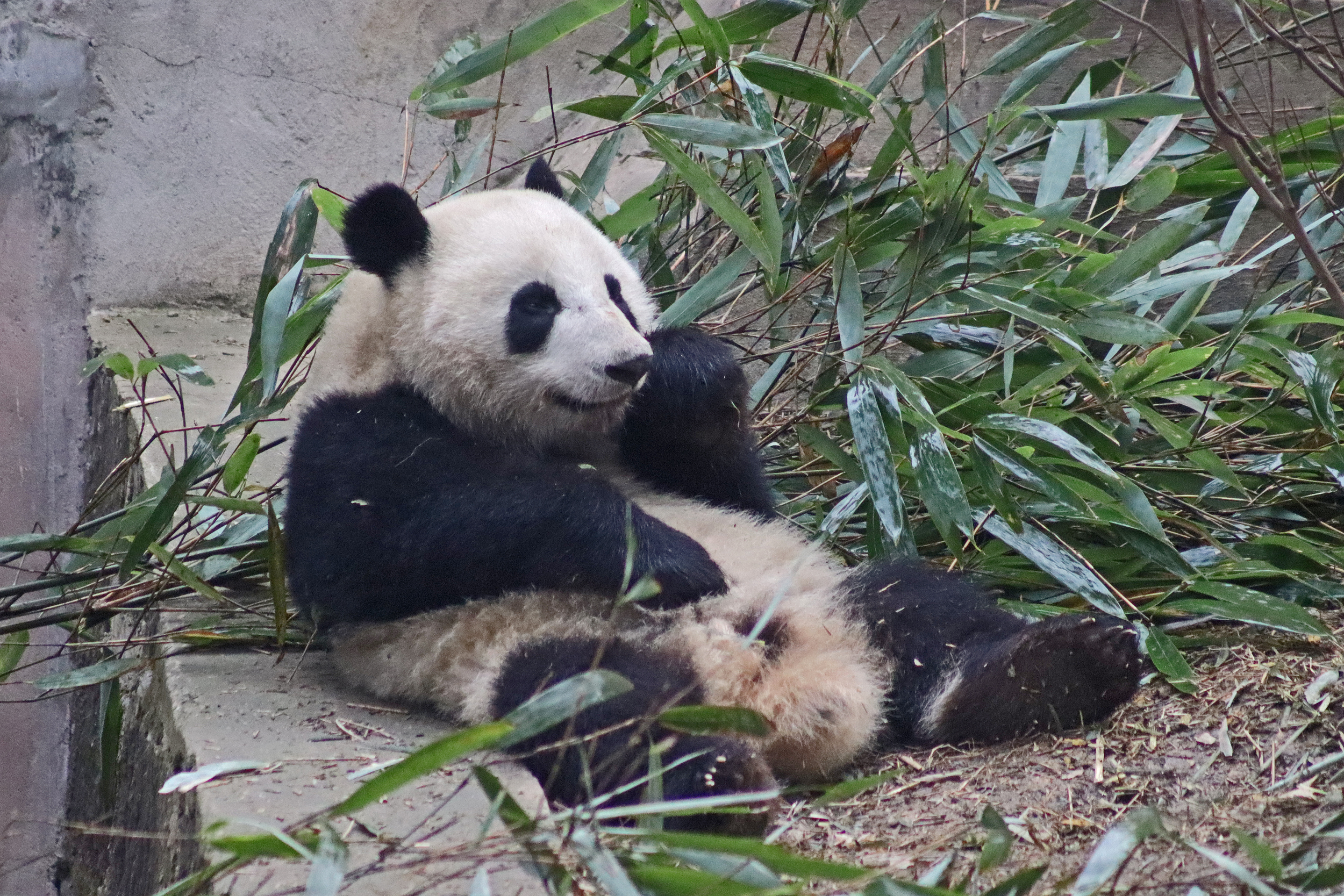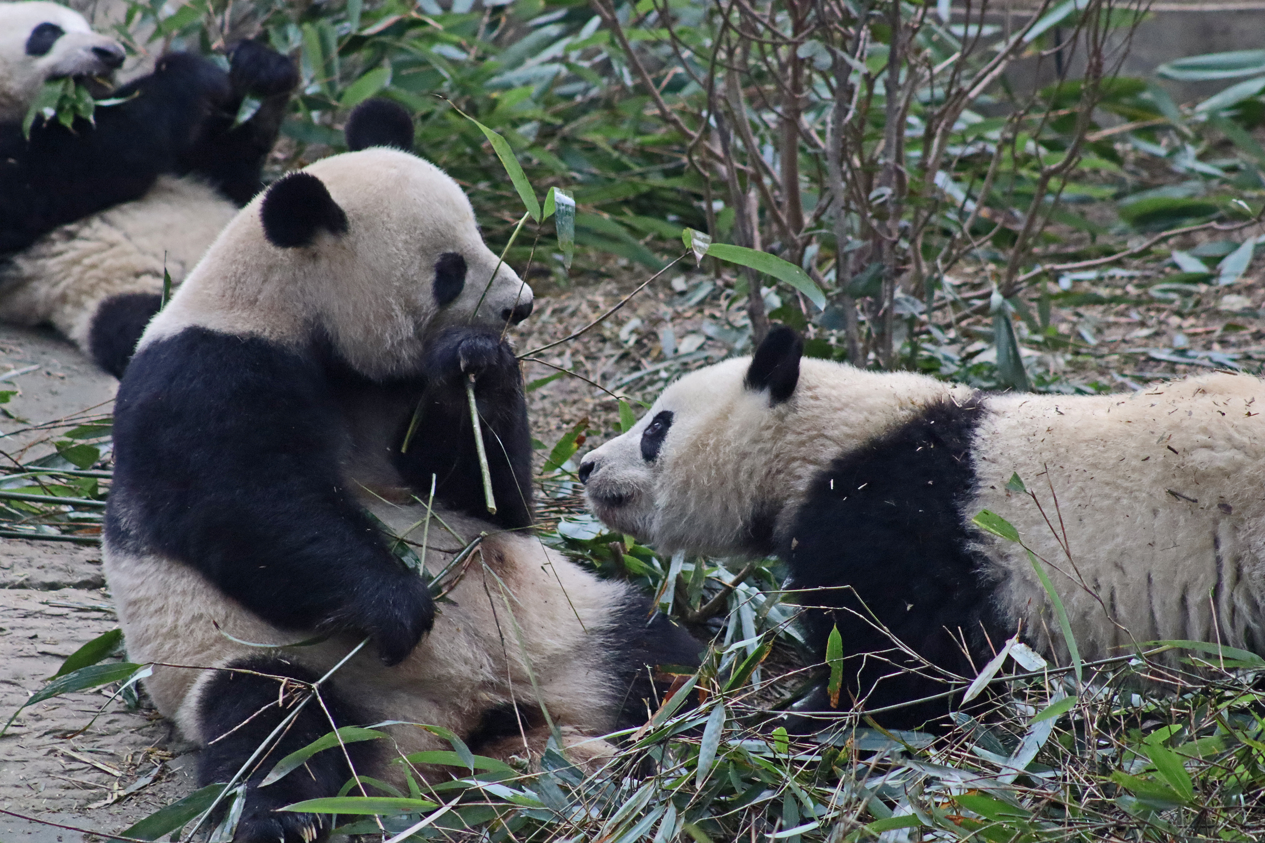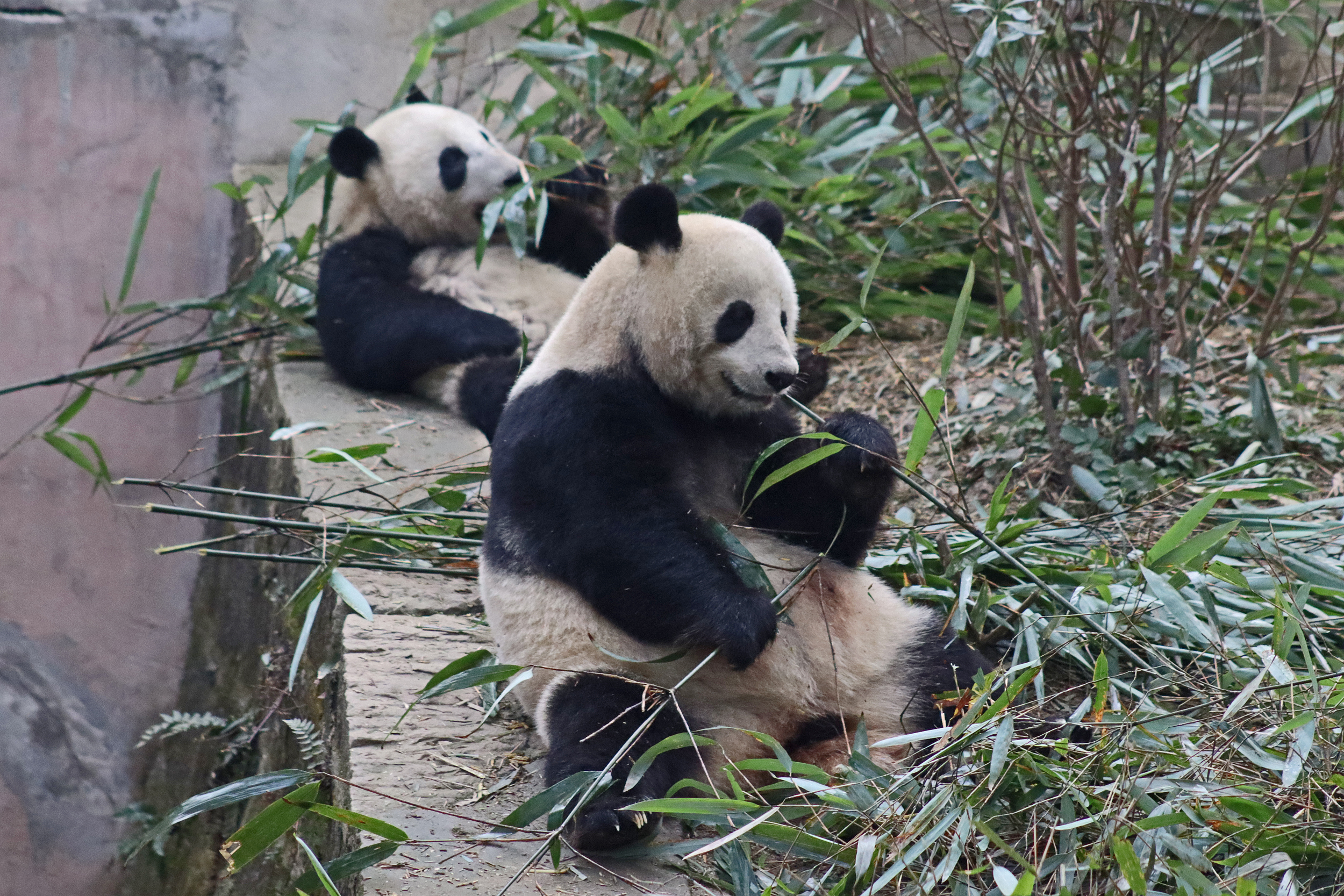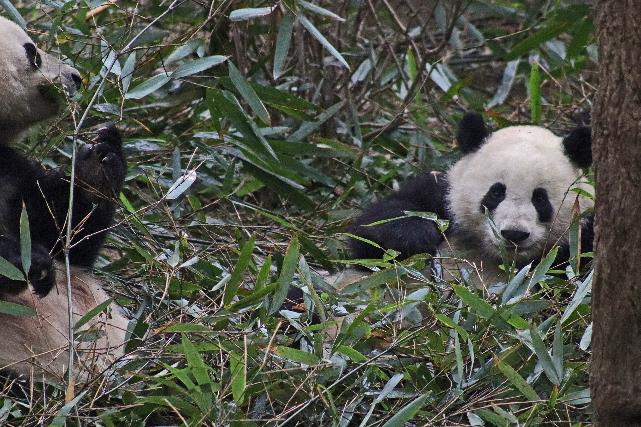 The final pandas to share about from the No1 House – and they were my first youngsters of Chengdu Panda Base on this visit, it’s Xiao Ya Tou 小丫头 and her 2023-born twins! Since my visit the cubs have now been announced as named CC and 99 … not sure how much I get that, but I guess there’s good reasoning behind it! When I was there there was only a sign for Xiao Ya Tou, you wouldn’t know there were her cubs in with her unless you saw them – and it’s a big yard with lots of plant coverage so they could easily hide away out of sight. Now, however, there is new signage so visitors know there are 3 pandas living there.