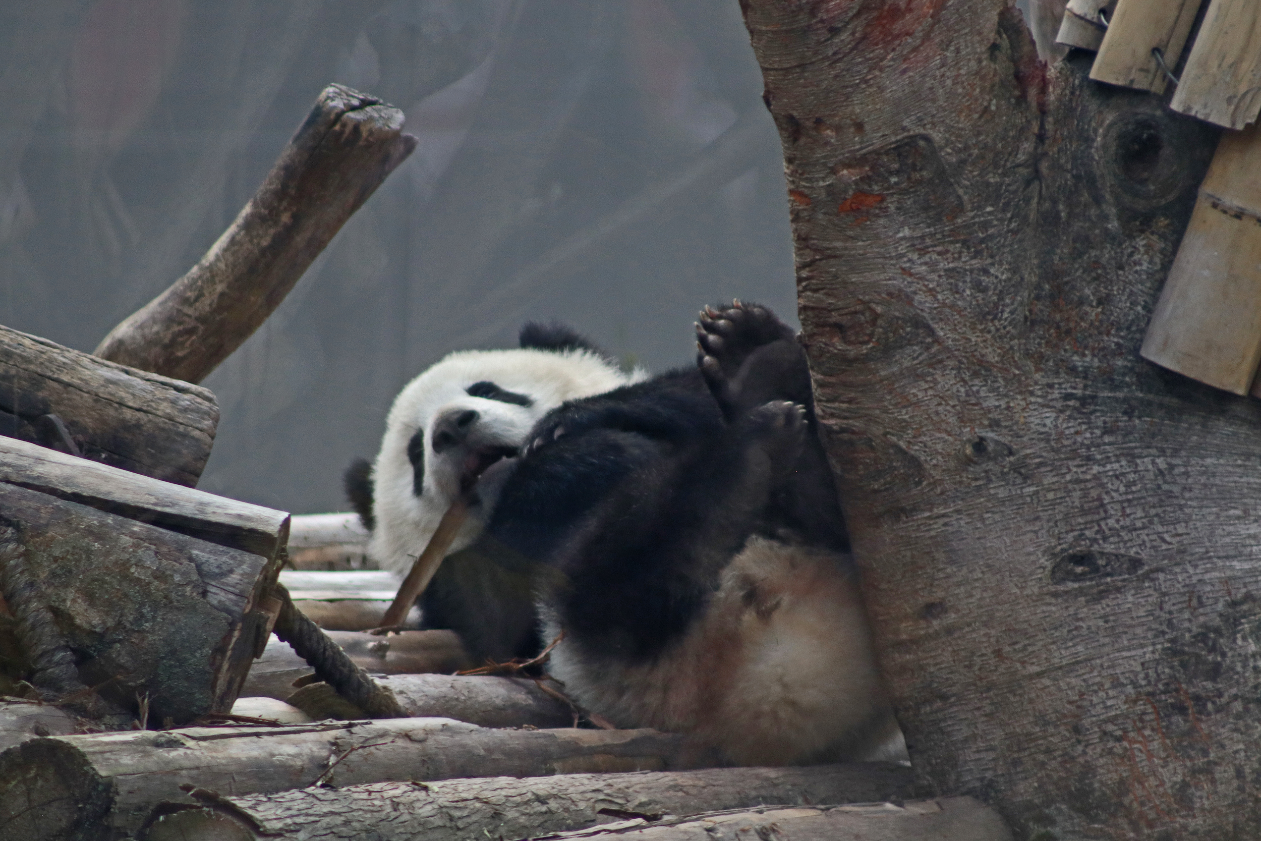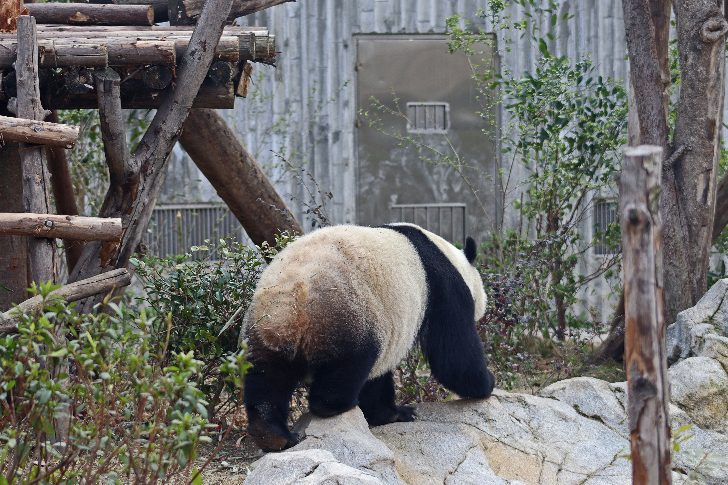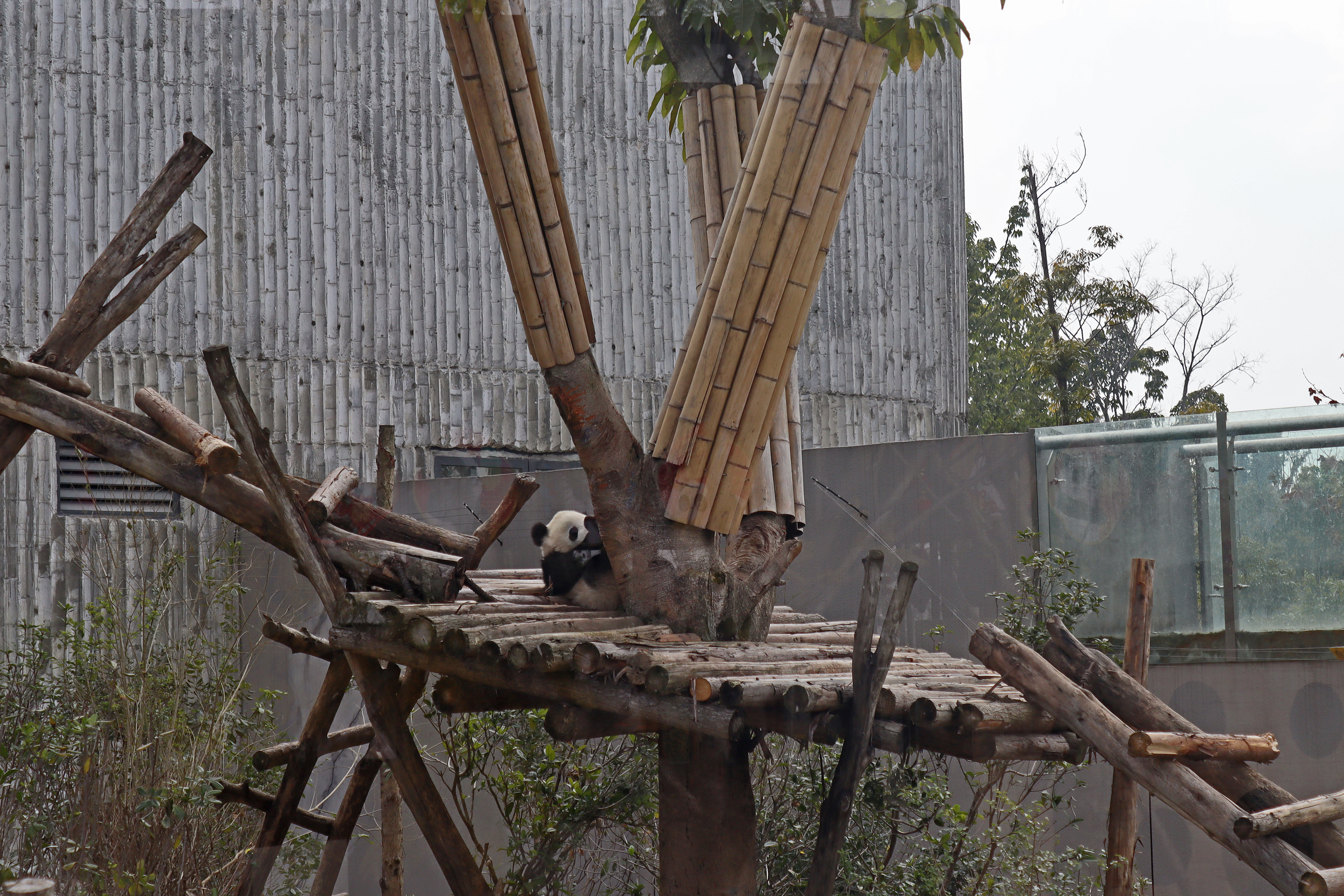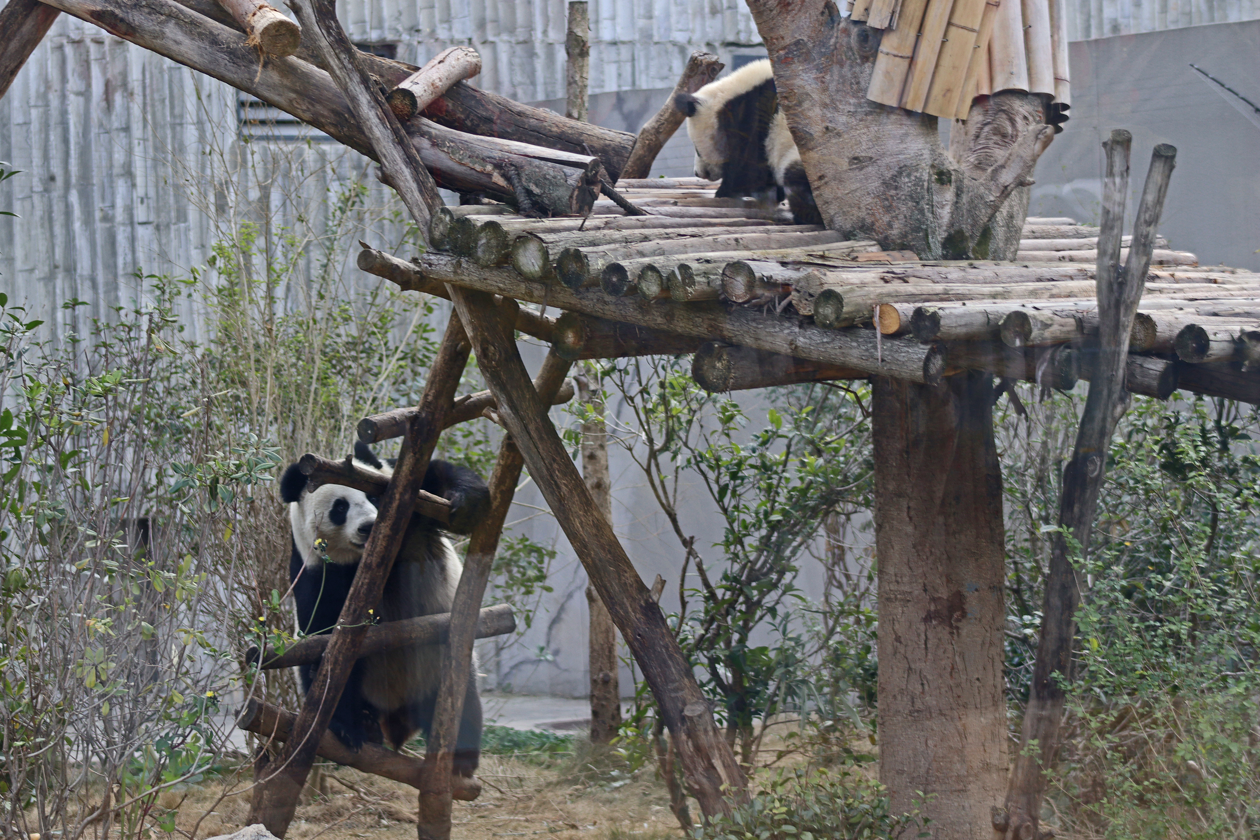 I quite liked this yard for it’s slightly smaller size, so technically should be easy to spot the panda in, but it also has a very nice climbing frame along with some rocks and a slightly hilly terrain. The only downside is that the viewing has a lot of glass windows – so the best view to see them together on the platform was through glass and it was quite tricky not to catch the reflection or a dirty smudge on the glass. There is an open section, although a lot of the space is stairs, so not ideal – I was just glad it wasn’t super busy so everyone could get into the optimal spot and get their photos.