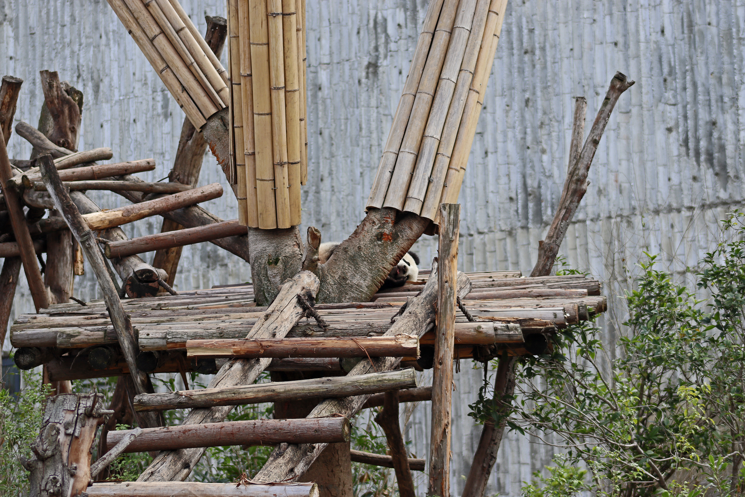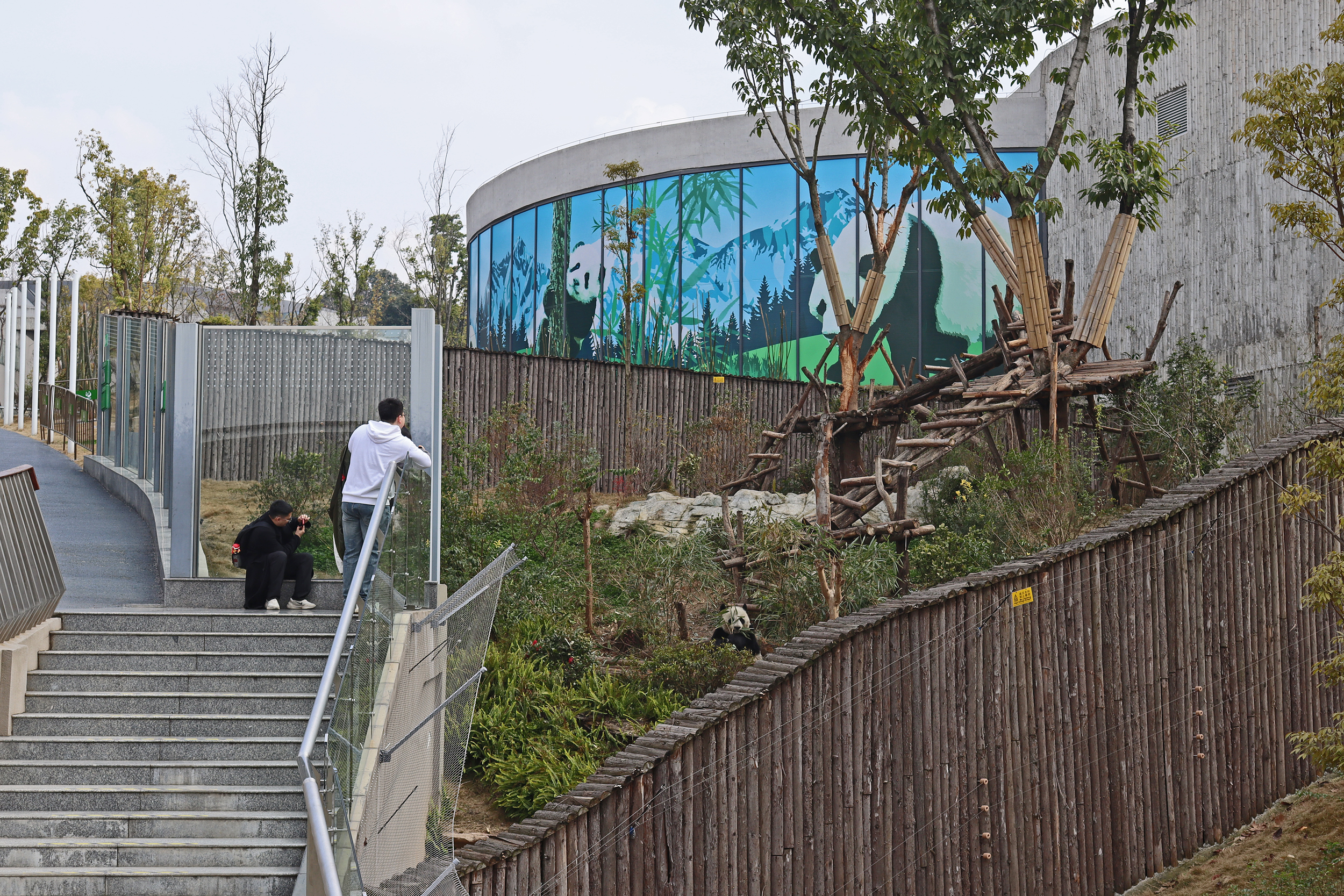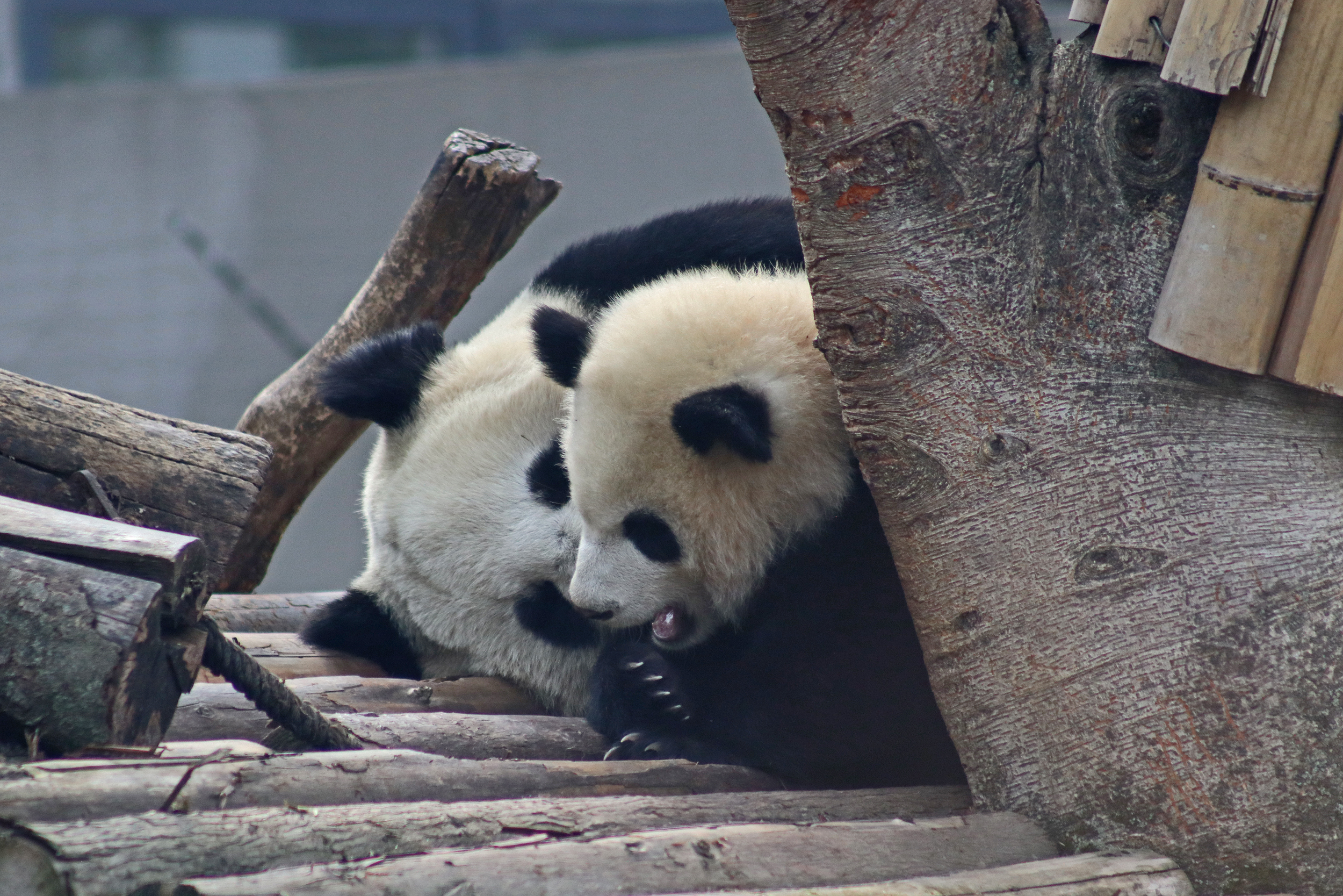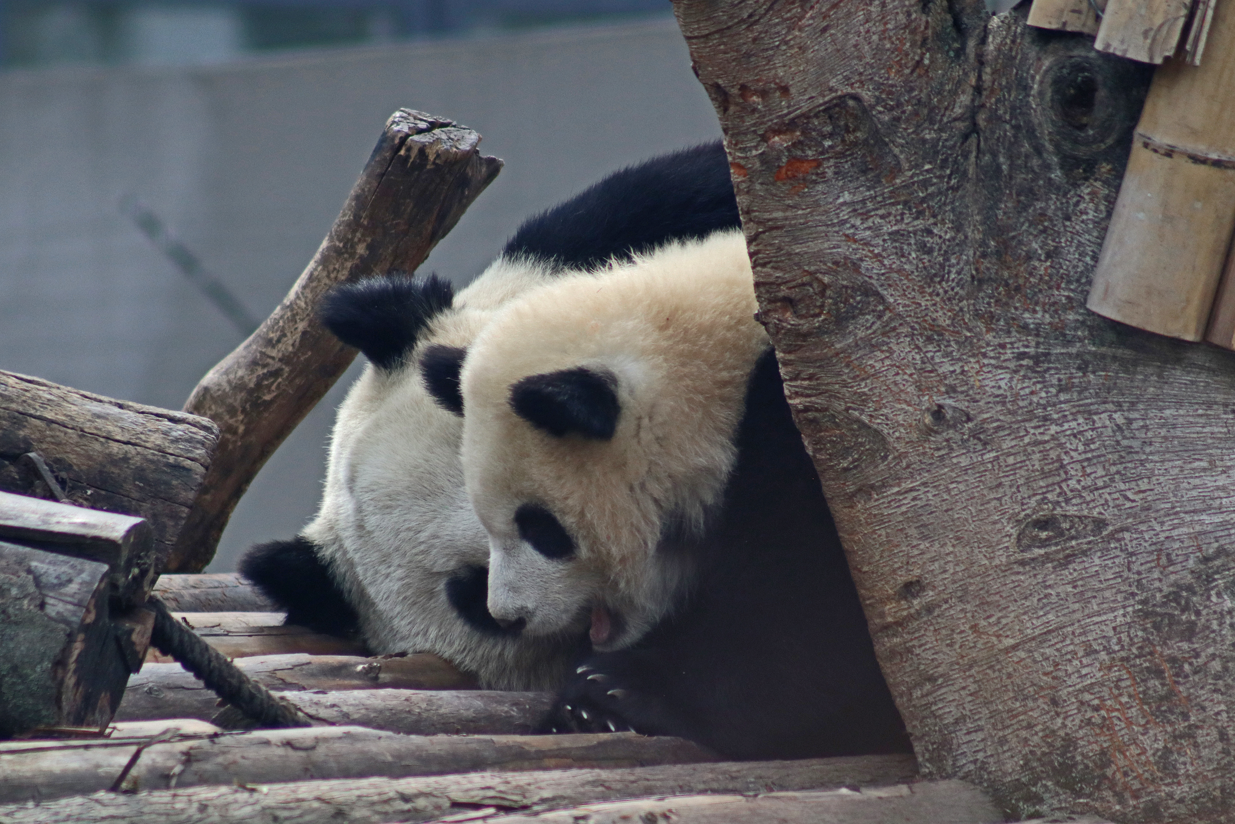 I quite liked this yard for it’s slightly smaller size, so technically should be easy to spot the panda in, but it also has a very nice climbing frame along with some rocks and a slightly hilly terrain. The only downside is that the viewing has a lot of glass windows – so the best view to see them together on the platform was through glass and it was quite tricky not to catch the reflection or a dirty smudge on the glass. There is an open section, although a lot of the space is stairs, so not ideal – I was just glad it wasn’t super busy so everyone could get into the optimal spot and get their photos.