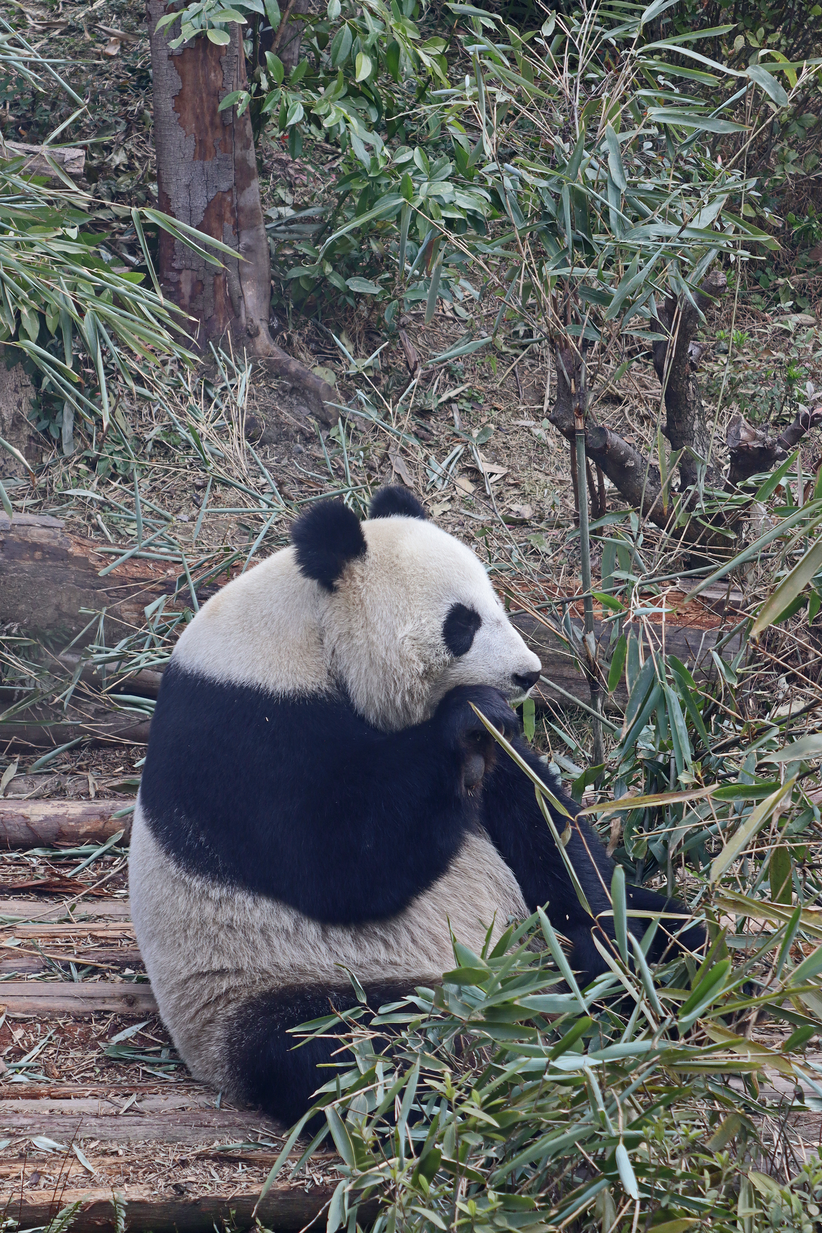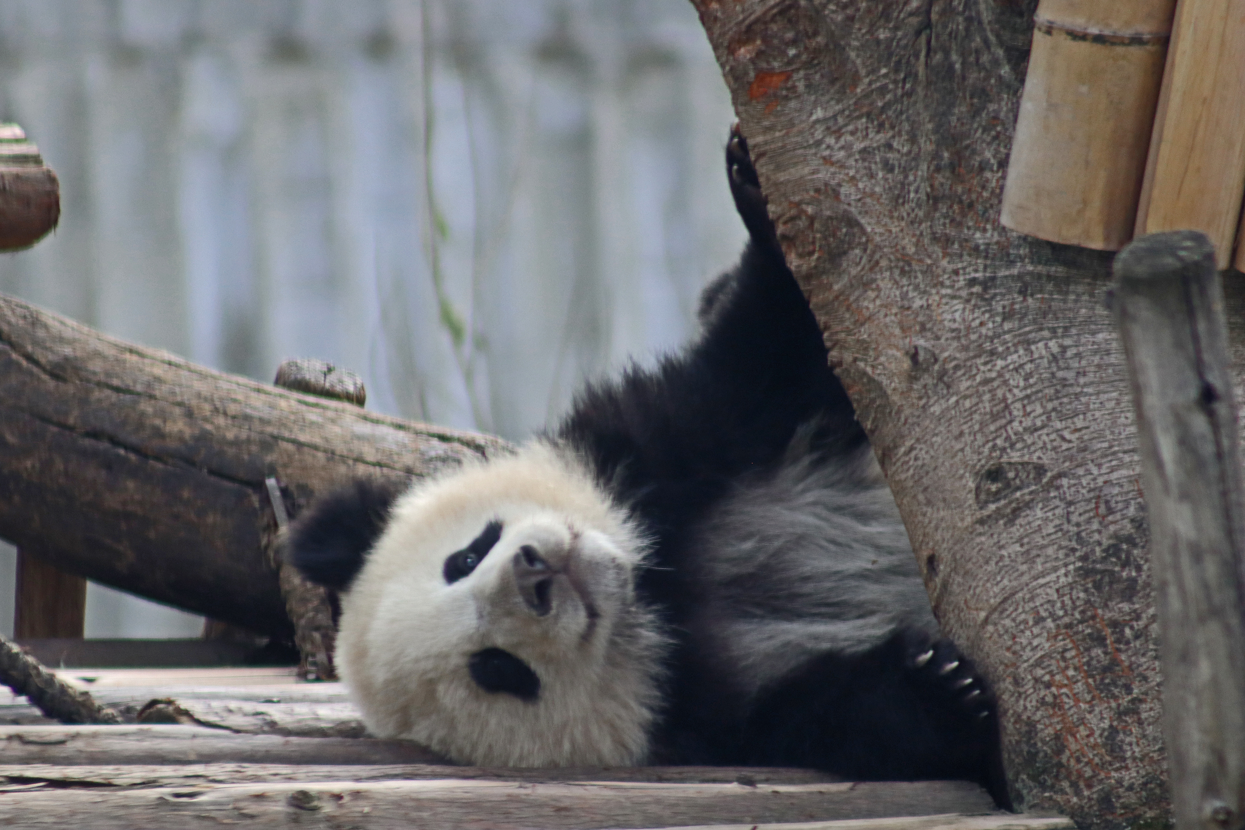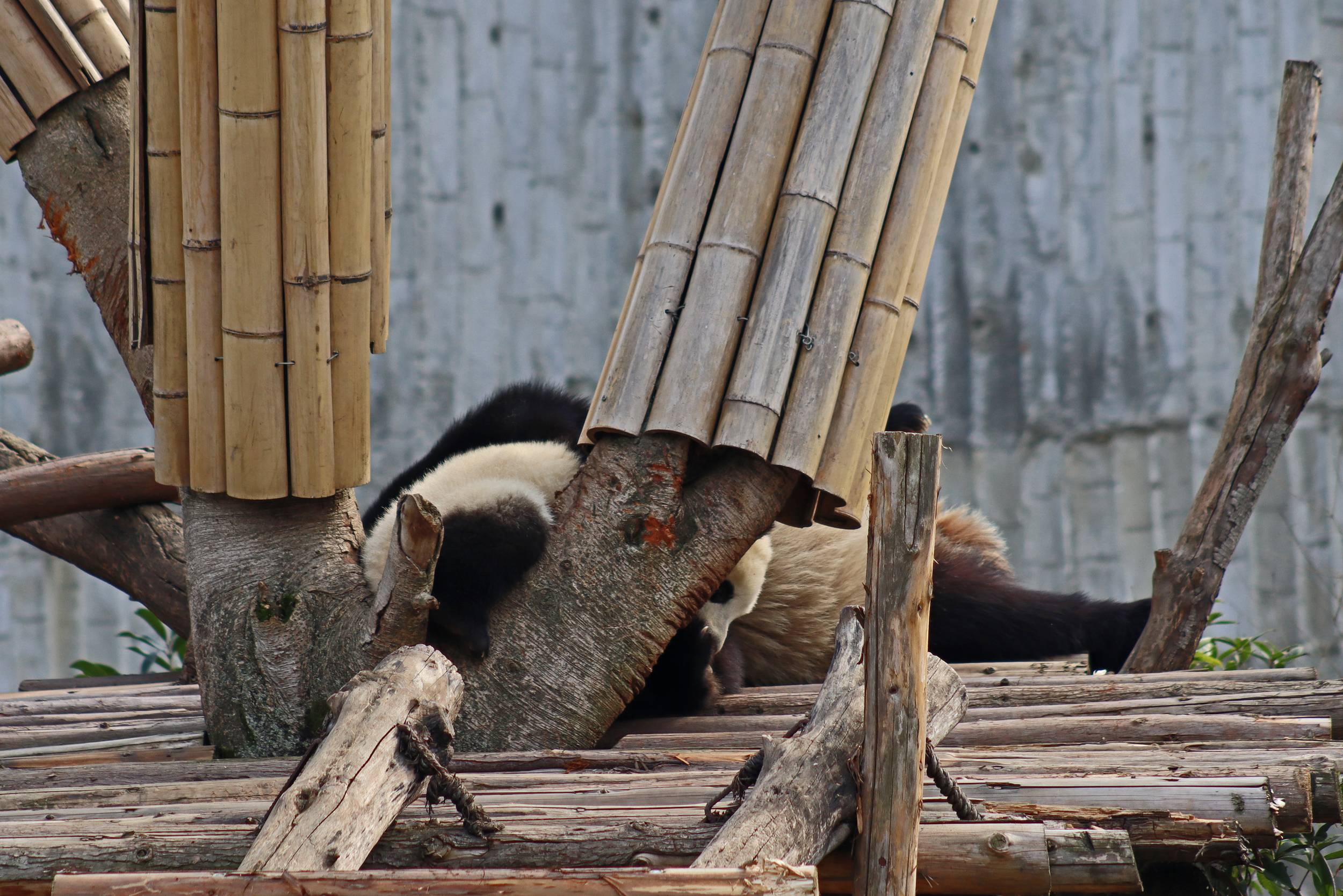 The third mum I saw was Xiu Qiu 绣球 with her 2024-born cub female Xiu Li 绣丽 – I only saw this pair on the first day of my visit, but I saw Xiu Qiu on my visit last year in this area. One thing I quite liked was that they were in a yard that was a little tucked away so there weren’t many people there and it wasn’t on a main route through the area like most of the other yards are in the Star Nursery House. For ages at the yard I only saw Xiu Qiu, and it was only when I was walking away and looked back that the cub appeared from behind the tree way up on the platform! I think lots of other visitors walked past without seeing her. Initially Xiu Qiu was sitting in a huge bamboo pile, making quick work of it, but after I saw the cub, she then also got up herself, had a small walk around the yard, then headed up the ladder to check on her baby – so sweet! The pair rolled around for a bit – baby was not wanting to be cuddled and wanted some freedom I think, but eventually mum got her way and they cuddled together up on the platform.