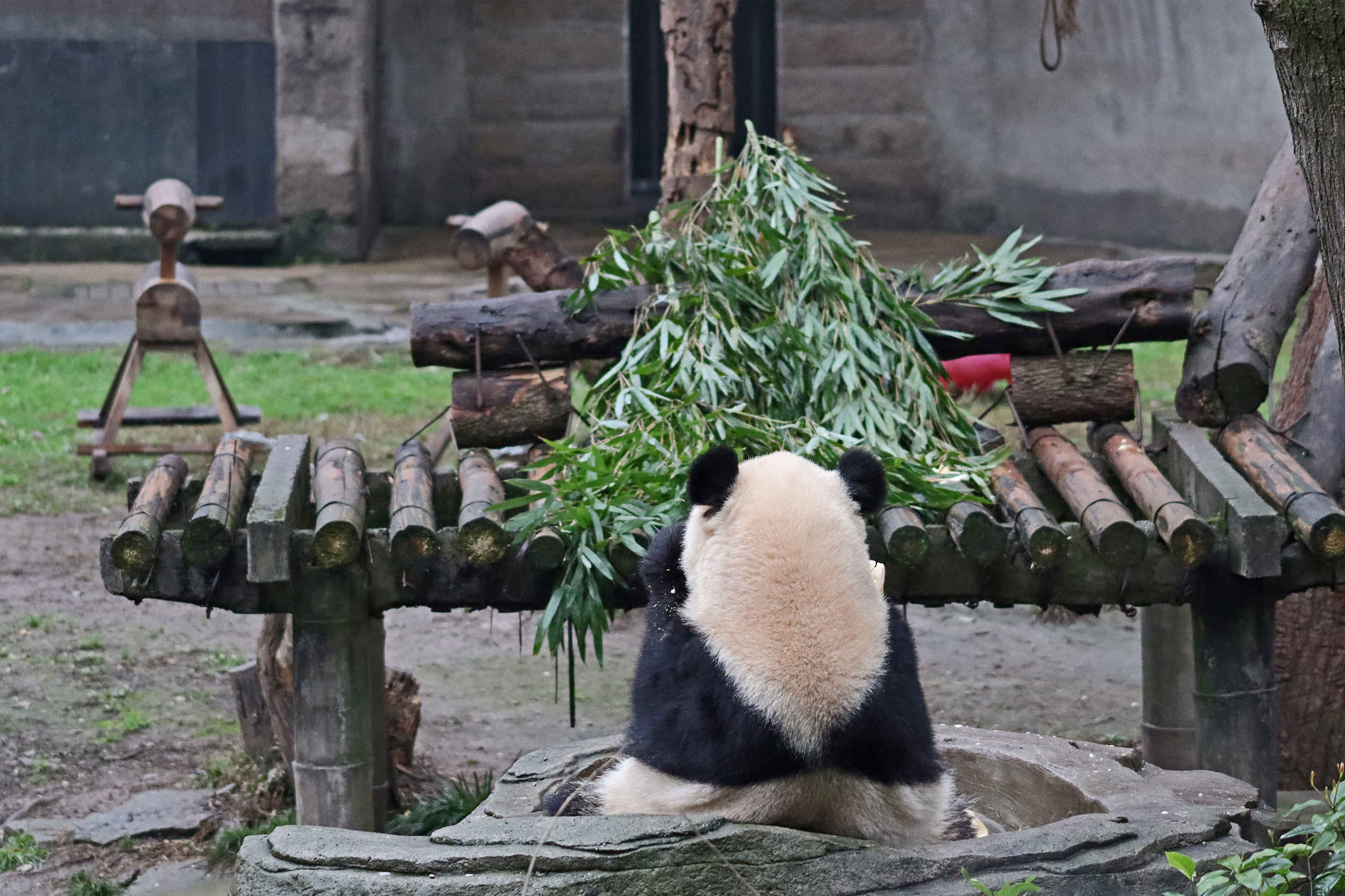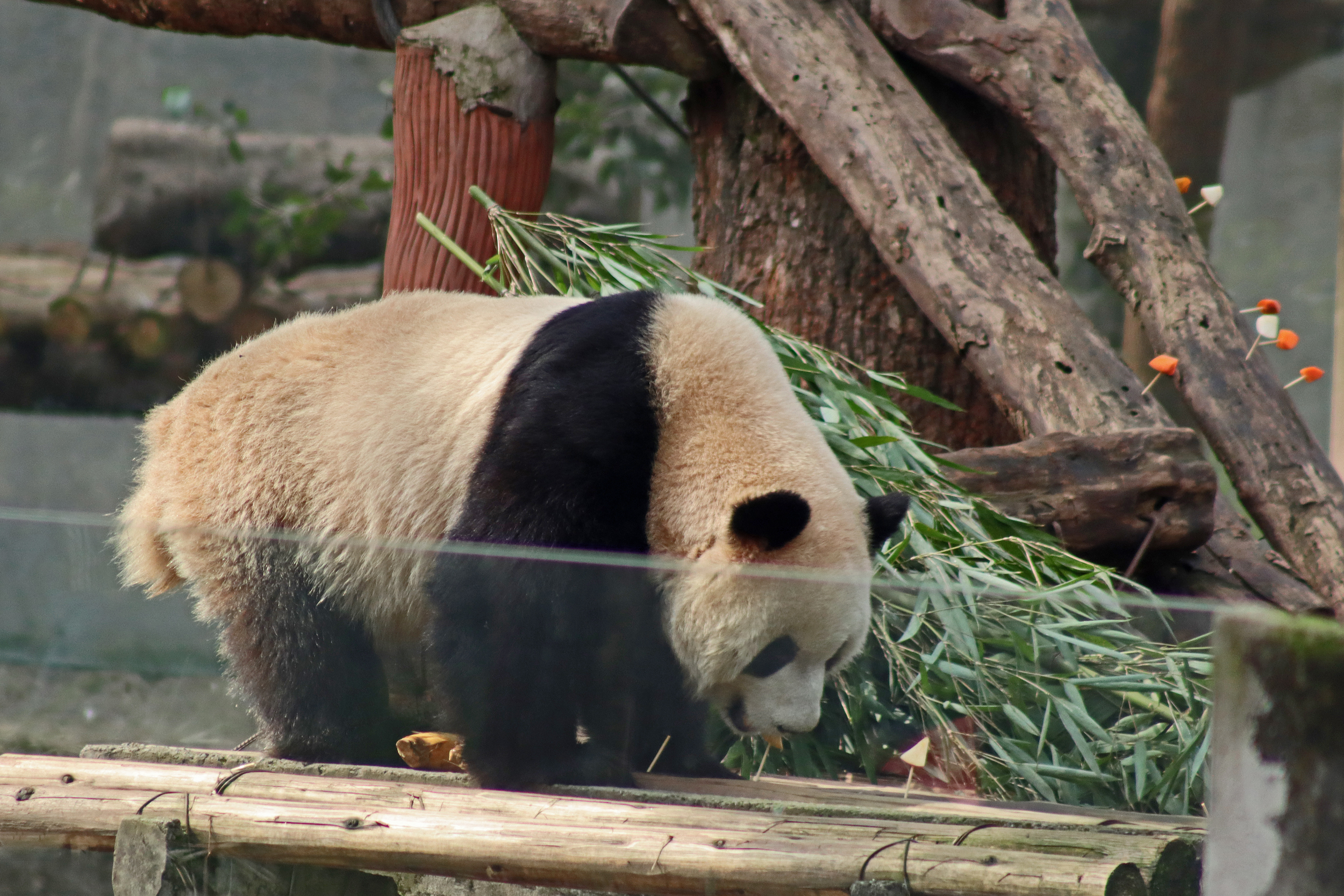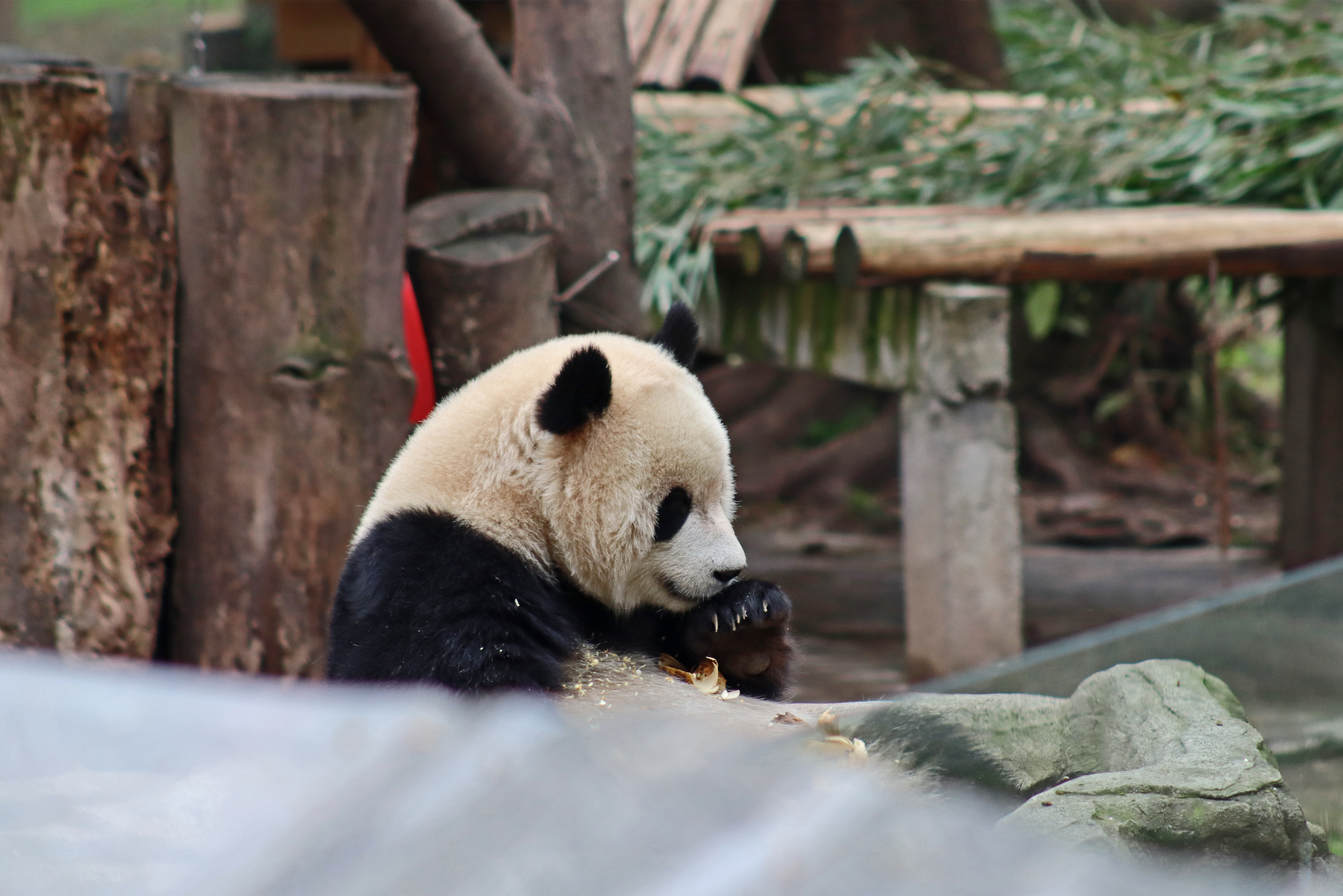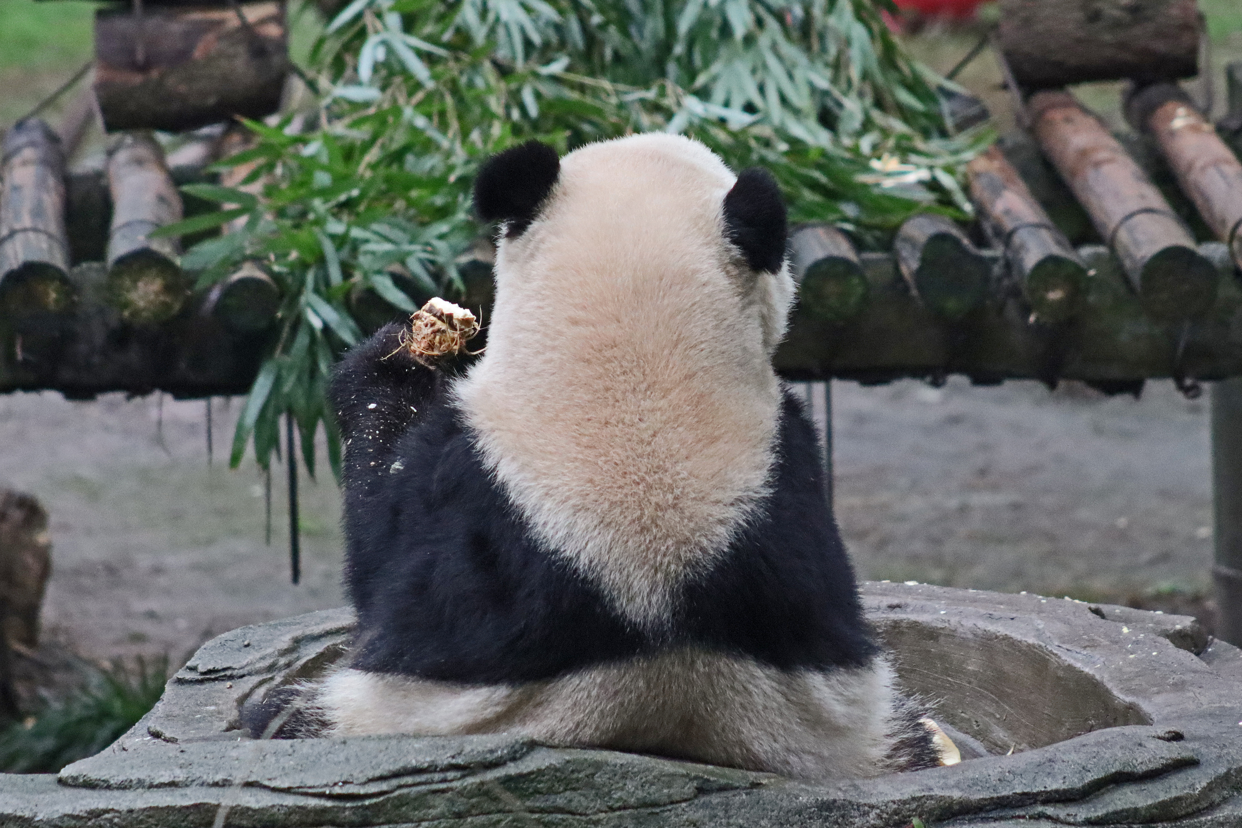 Where I saw Yu Ai in the morning, Yu Ke seemed to be more of an afternoon panda and made his appearance after lunchtime – this worked out perfect for me so I could see both easily, but they are neighbours, so there are some good spots right between both yards that make for perfect viewing of either panda. He also liked to make use of his stone basin for sitting in to enjoy bamboo shoots, but in the classic panda pose of back to the people XD A view I am very used to! Luckily I was there later in the day when the keeper was carefully placing out some food enrichment – there were lots of cut up pieces of fruit on sticks which were dotted around branches and on the platform near the front of the yard. When Yu Ke was then allowed in he headed straight for the front to get some of his treats, the delicacy used to pull off the fruit was amazing and for the pieces where he also got the stick he pulled the stick out of his mouth after getting the fruit off. I’ve not seen this type of enrichment used for pandas before and I think it’s a great idea – it’s likely this is alternated with providing the fruit on a table for them. Yu Ke is just as cute as sister Yu Ai, they have the most adorable and loveable round fluffy faces that are incredibly recognisable. I sure hope I get to see these two again =)