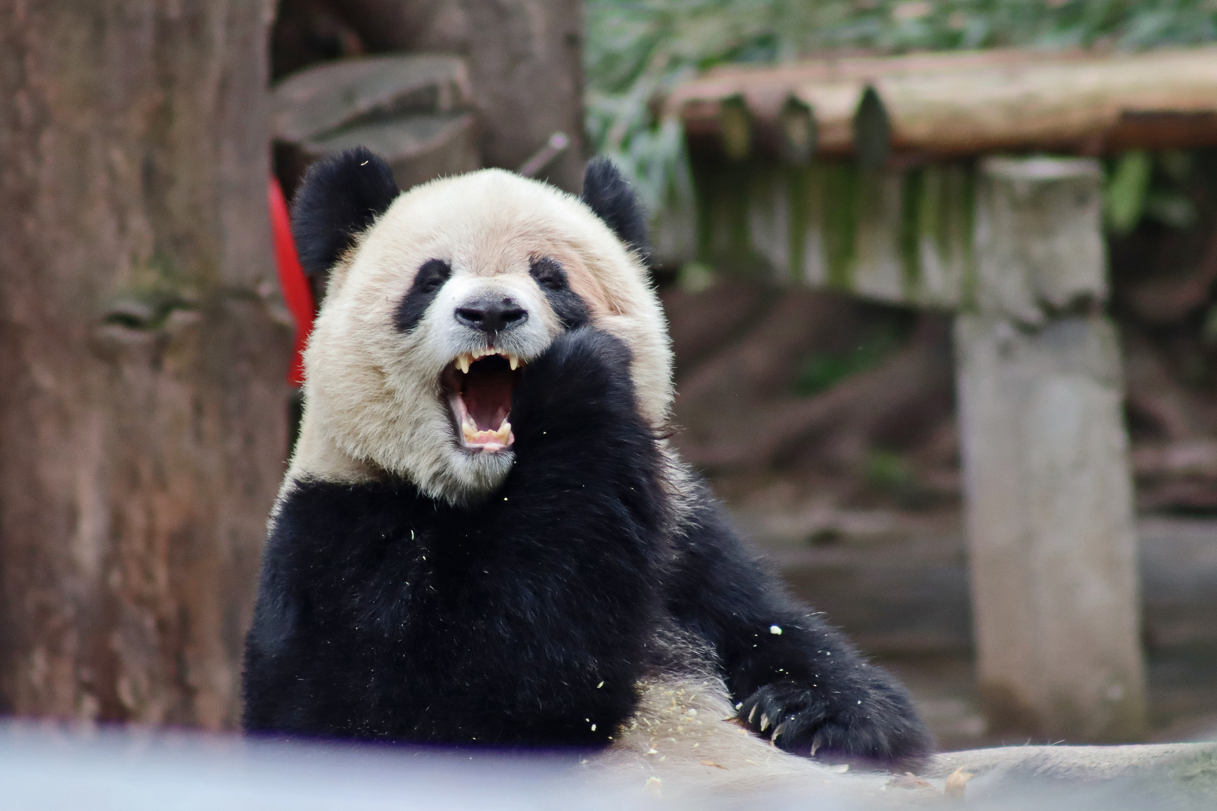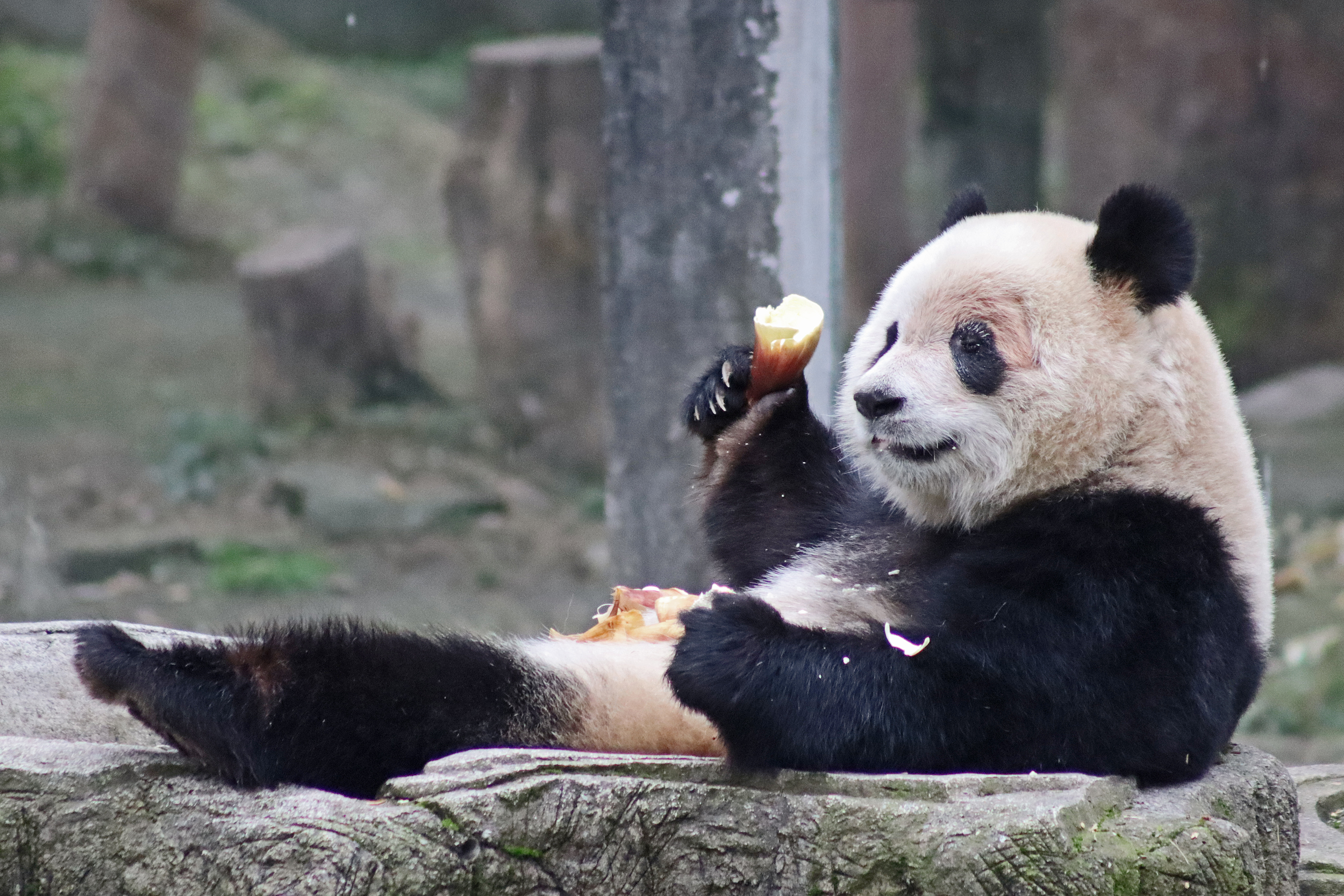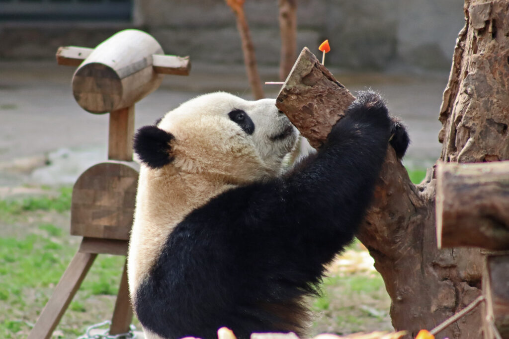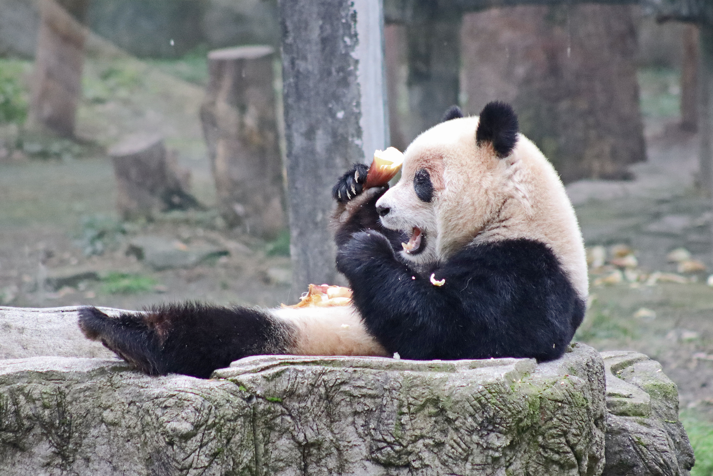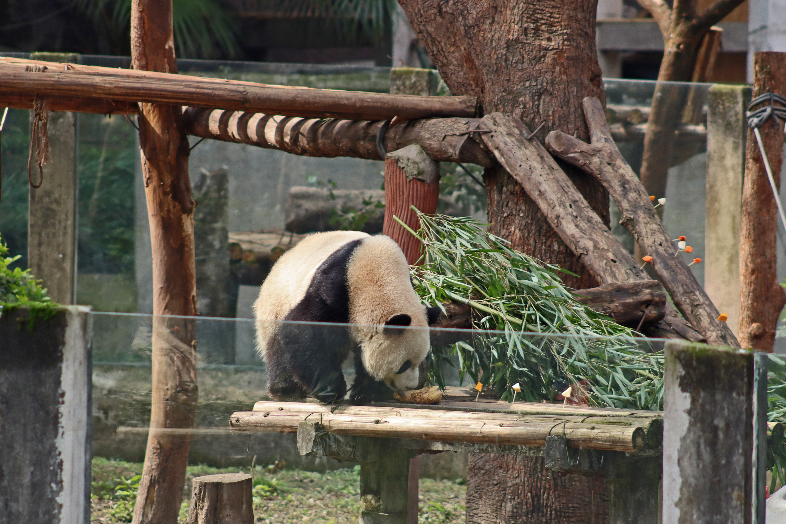 Where I saw Yu Ai in the morning, Yu Ke seemed to be more of an afternoon panda and made his appearance after lunchtime – this worked out perfect for me so I could see both easily, but they are neighbours, so there are some good spots right between both yards that make for perfect viewing of either panda. He also liked to make use of his stone basin for sitting in to enjoy bamboo shoots, but in the classic panda pose of back to the people XD A view I am very used to! Luckily I was there later in the day when the keeper was carefully placing out some food enrichment – there were lots of cut up pieces of fruit on sticks which were dotted around branches and on the platform near the front of the yard. When Yu Ke was then allowed in he headed straight for the front to get some of his treats, the delicacy used to pull off the fruit was amazing and for the pieces where he also got the stick he pulled the stick out of his mouth after getting the fruit off. I’ve not seen this type of enrichment used for pandas before and I think it’s a great idea – it’s likely this is alternated with providing the fruit on a table for them. Yu Ke is just as cute as sister Yu Ai, they have the most adorable and loveable round fluffy faces that are incredibly recognisable. I sure hope I get to see these two again =)