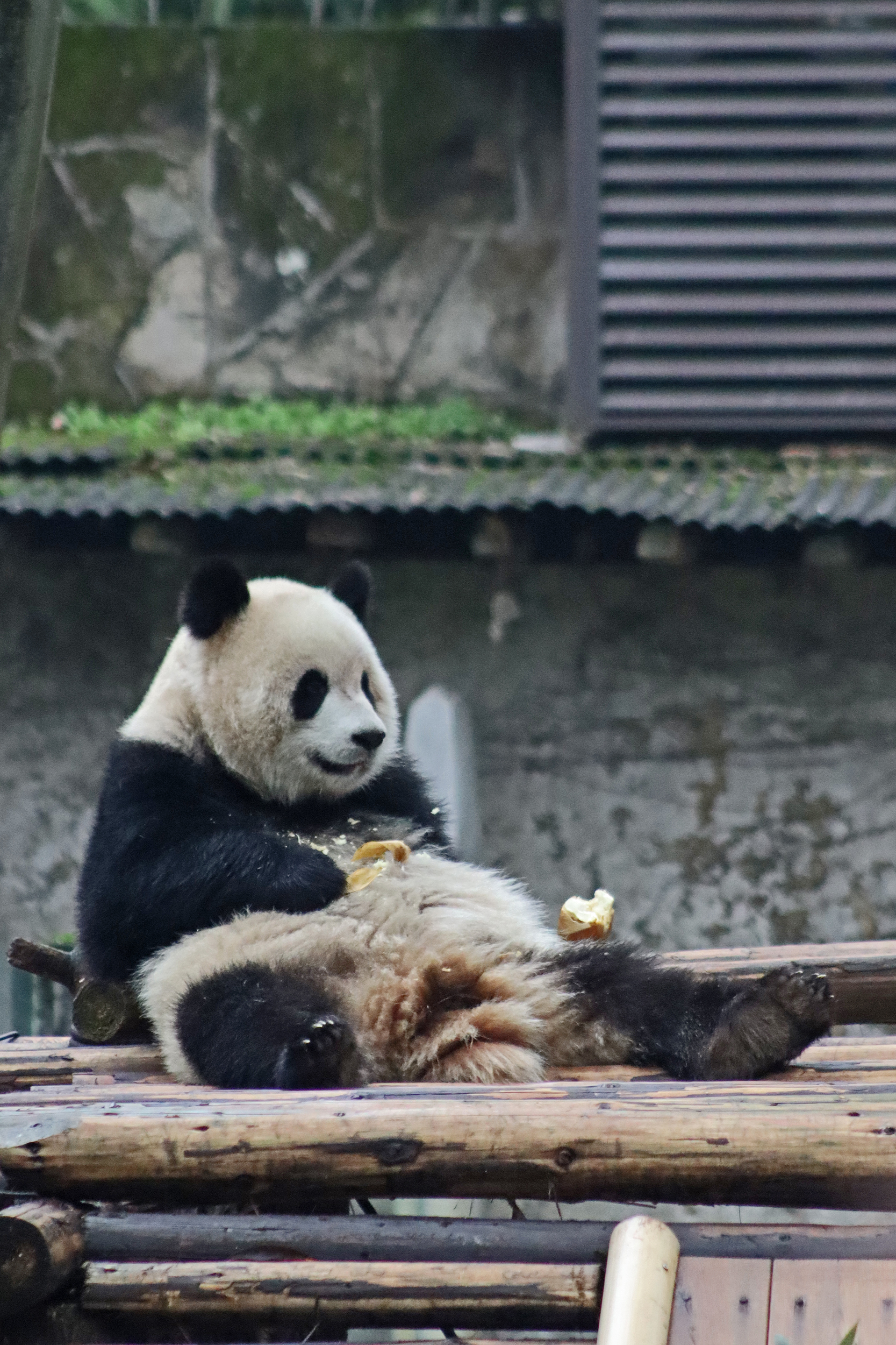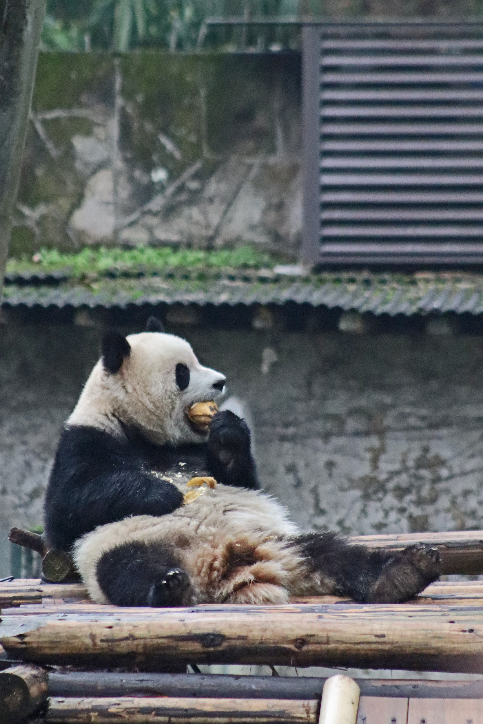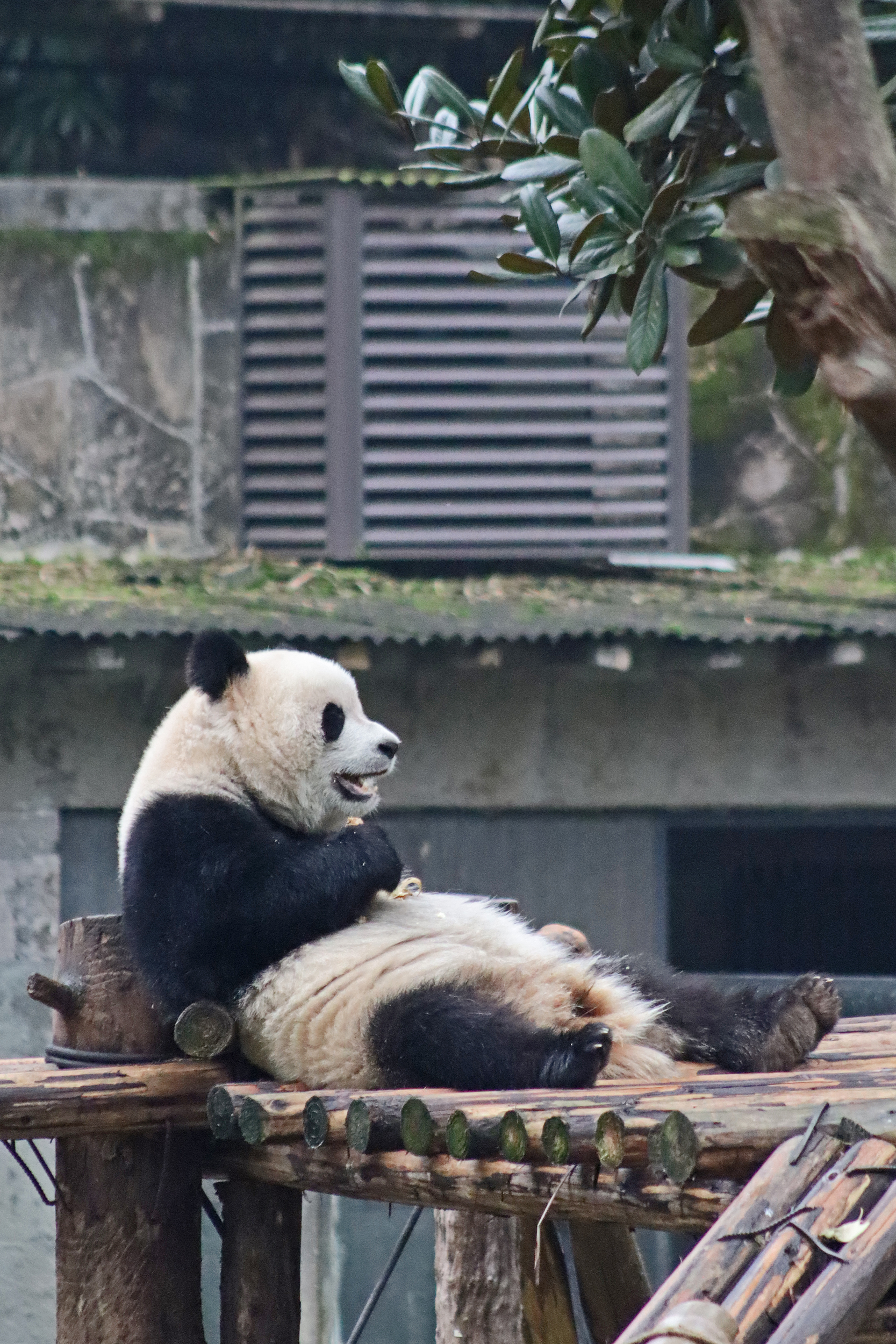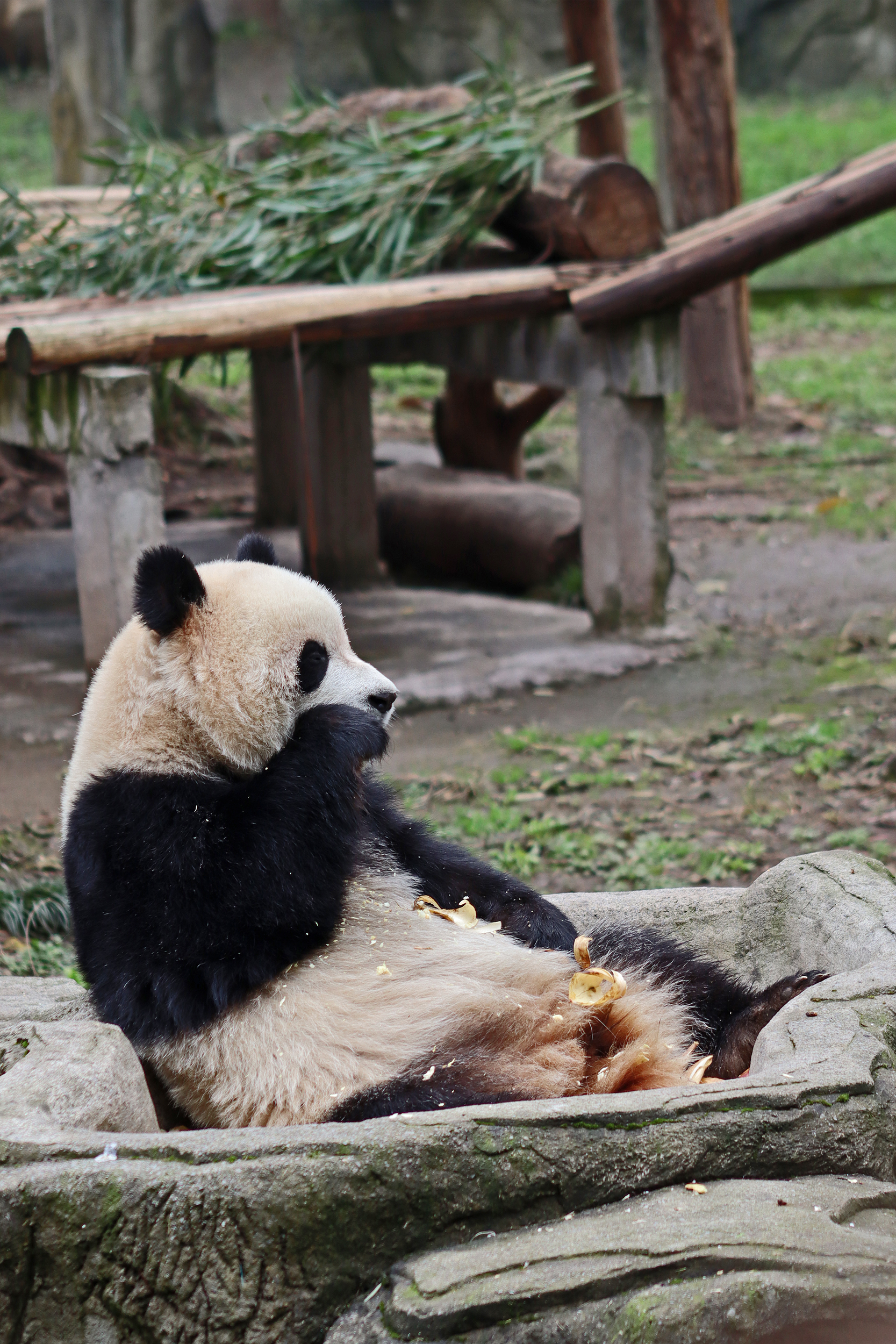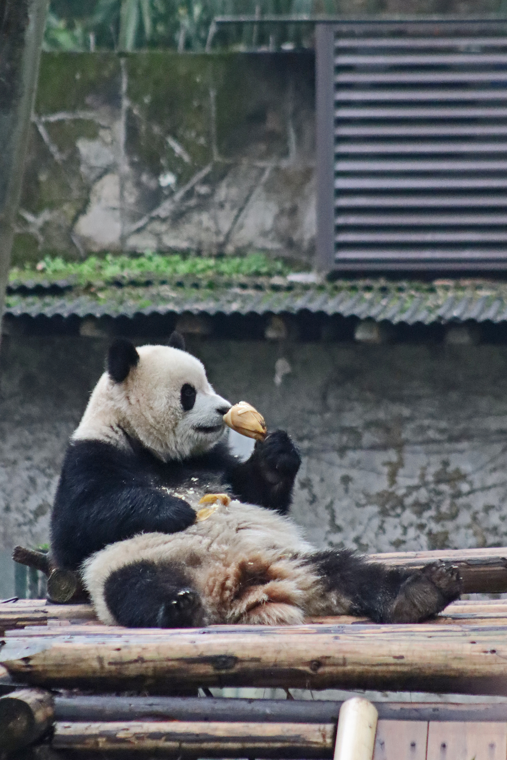 I saw most of Yu Ai in the morning time – she was outside and eating on the platform when I arrived and was super chilled out about it despite the huge crowds! In fact she actually spent almost all the time I saw her eating^ She’s so so cute, even moreso than she comes across in pictures. And her eye is looking much better, with just a little discolouring to her fur. She was relaxed on a high platform when I first saw her, lounging back and munching on bamboo shoots – in fact she mostly got bamboo shoots when I was watching her. When I next saw her she was still going on the bamboo shoots, but sitting in a lower down stone basin, perhaps this is a water fountain in the warmer months. It looked like a great spot to sit and had the perfect edge for leaning back against. Later in the afternoon when neighbour Mang Can Can was playing, she even was up on a platform and looking over to him, so cute! Yu Ai now is in the yard with Mang Can Can‘s car, I didn’t see her in it, but it’s a great feature piece to a yard.