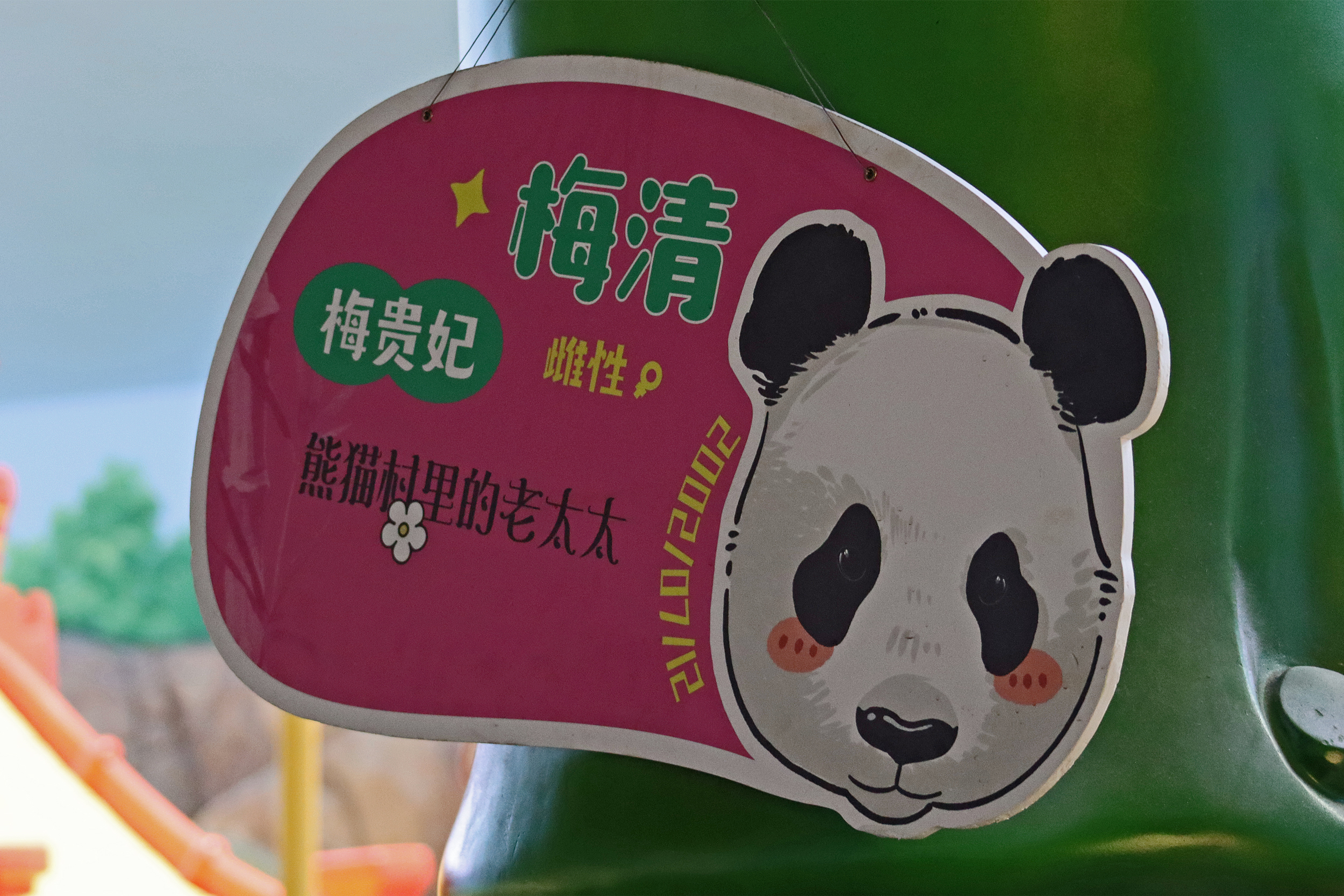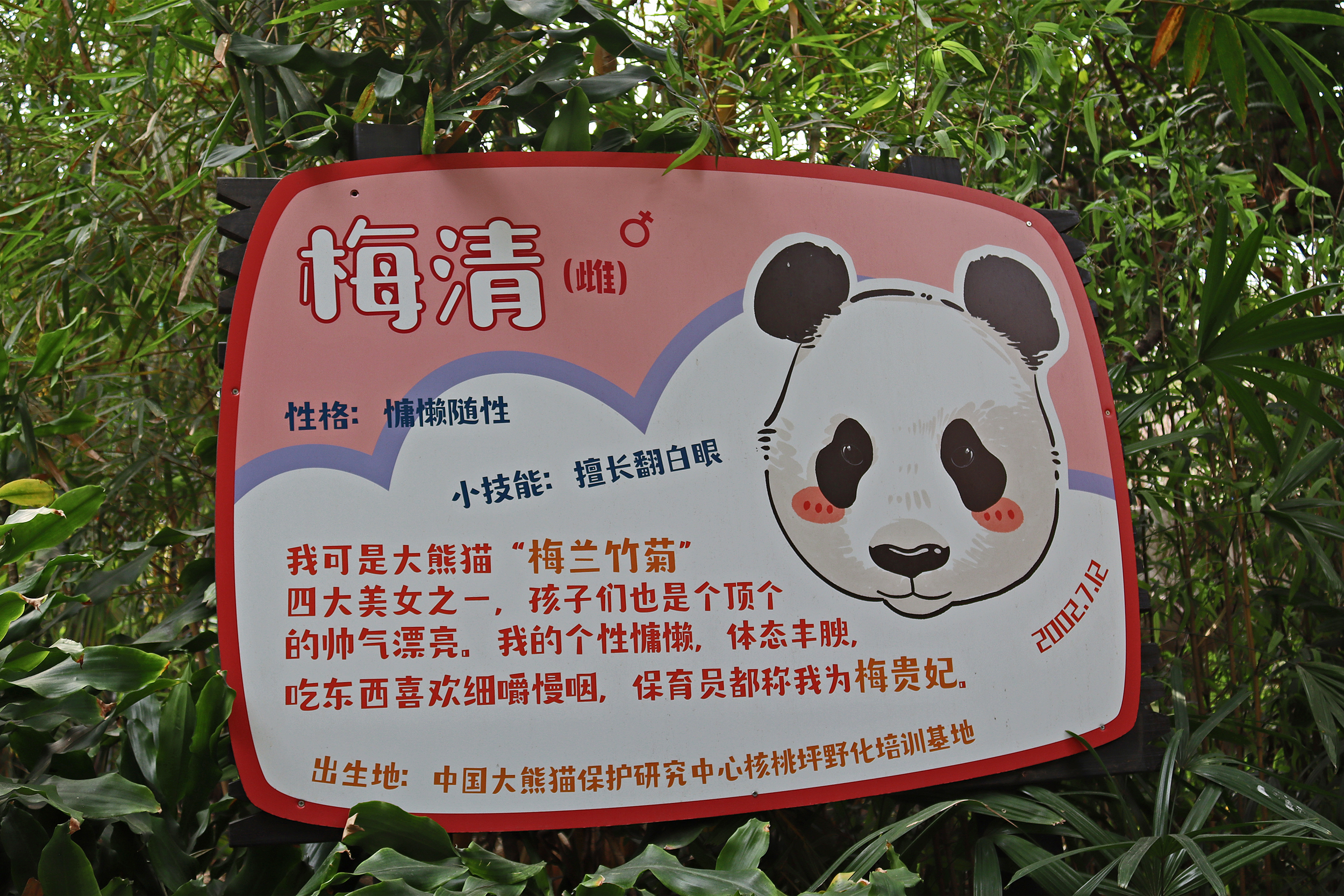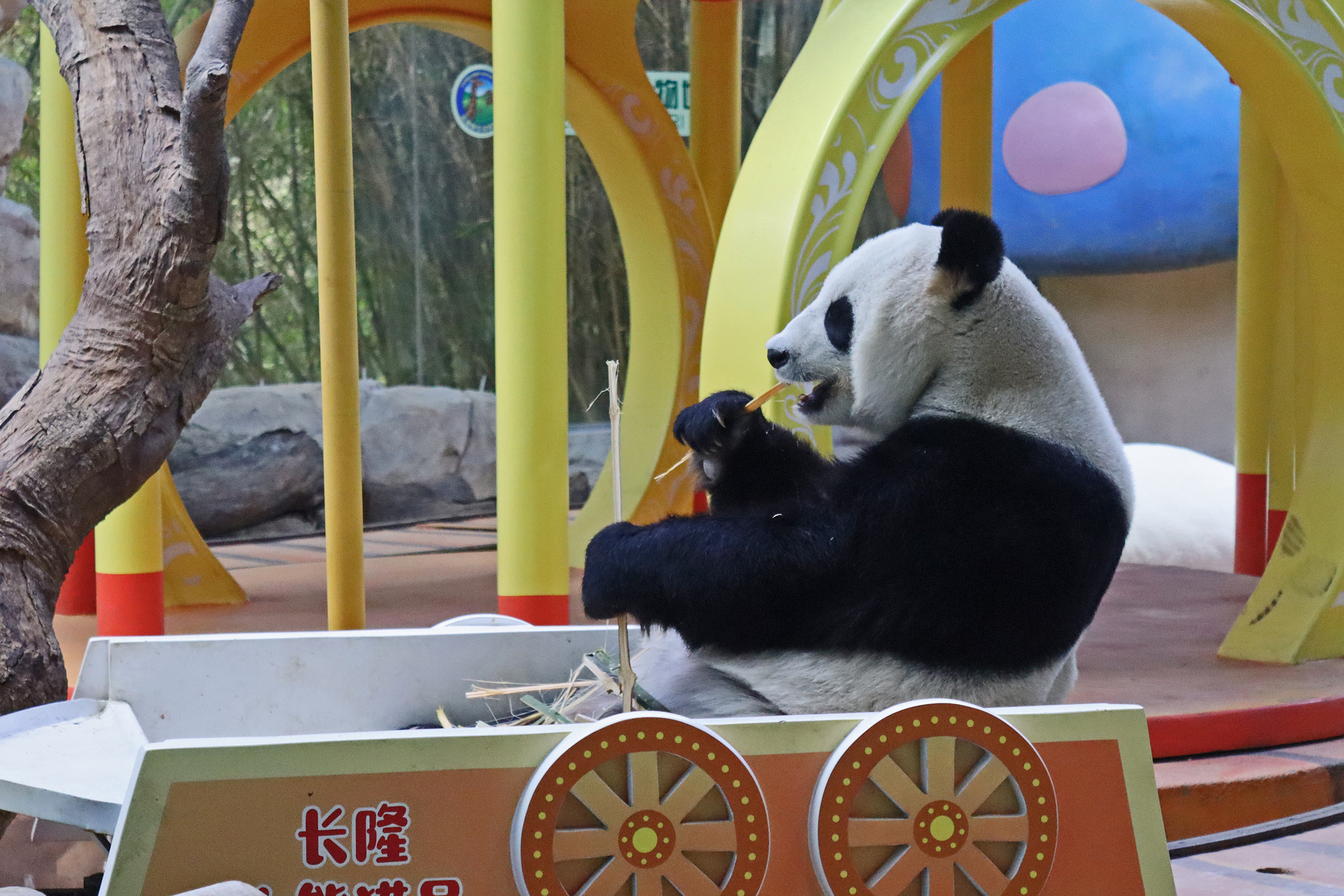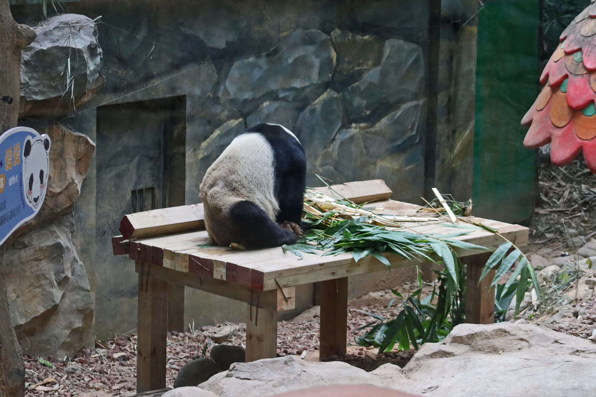 And the third panda for this post, and actually the last one I saw in this panda section was Mei Qing 梅清, a 22.5 year old female. She was born in Wolong and spent the first 10 years of her life around the Wolong and Ya’an bases before moving to Chimelong in 2012 and has been here ever since. And let me say, she looks great for her age, she didn’t seem in her 20’s at all when I saw her! So she was in the indoor yard with the train which was very exciting for me to finally see, but I think it looks like her and the panda in the outdoor yard next door alternate between yards based on the signs that were up as I saw more information about her at the outdoor yard. When I first got to her space I was so excited to see that she was sitting in the train carriage, honestly made my day! I had hoped to see the train going around the track, but sadly didn’t see it (something for next time^), but she was super cute sitting there and enjoying some bamboo! I came round by her yard several times, so saw her in the train, taking a snooze against a tree, relaxing ontop of her ice block, climbing, and eating more bamboo – she really was quite active, so I was super lucky with this! While she was very popular, I was able to get good spaces to get photos of her – this yard was completely glass-free so the viewing was excellent, I just found it was quite dark especially as it was so bright outside. Her signs say that she has quite a lazy personality and that she likes to eat slowly, as well as saying that her four children are very handsome and beautiful (I think I can agree to that =D).