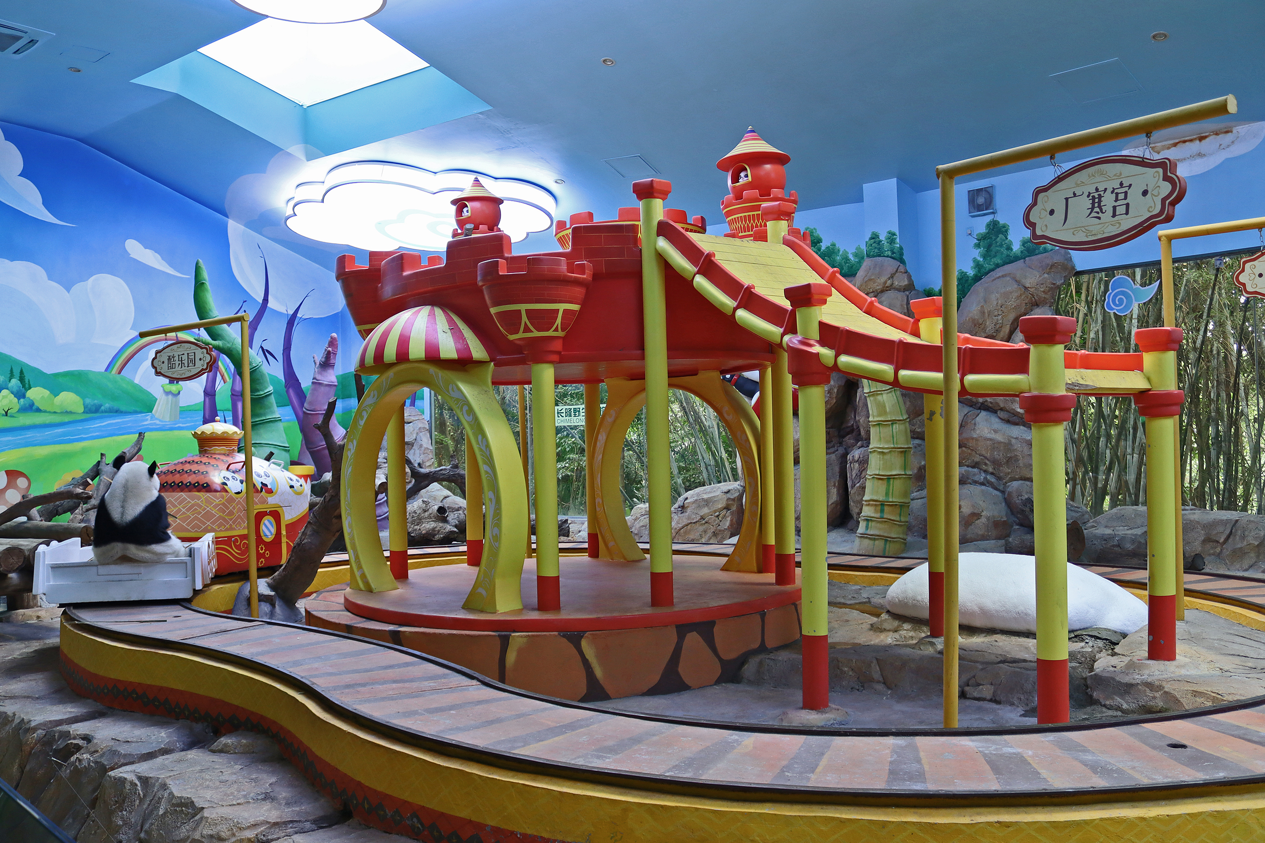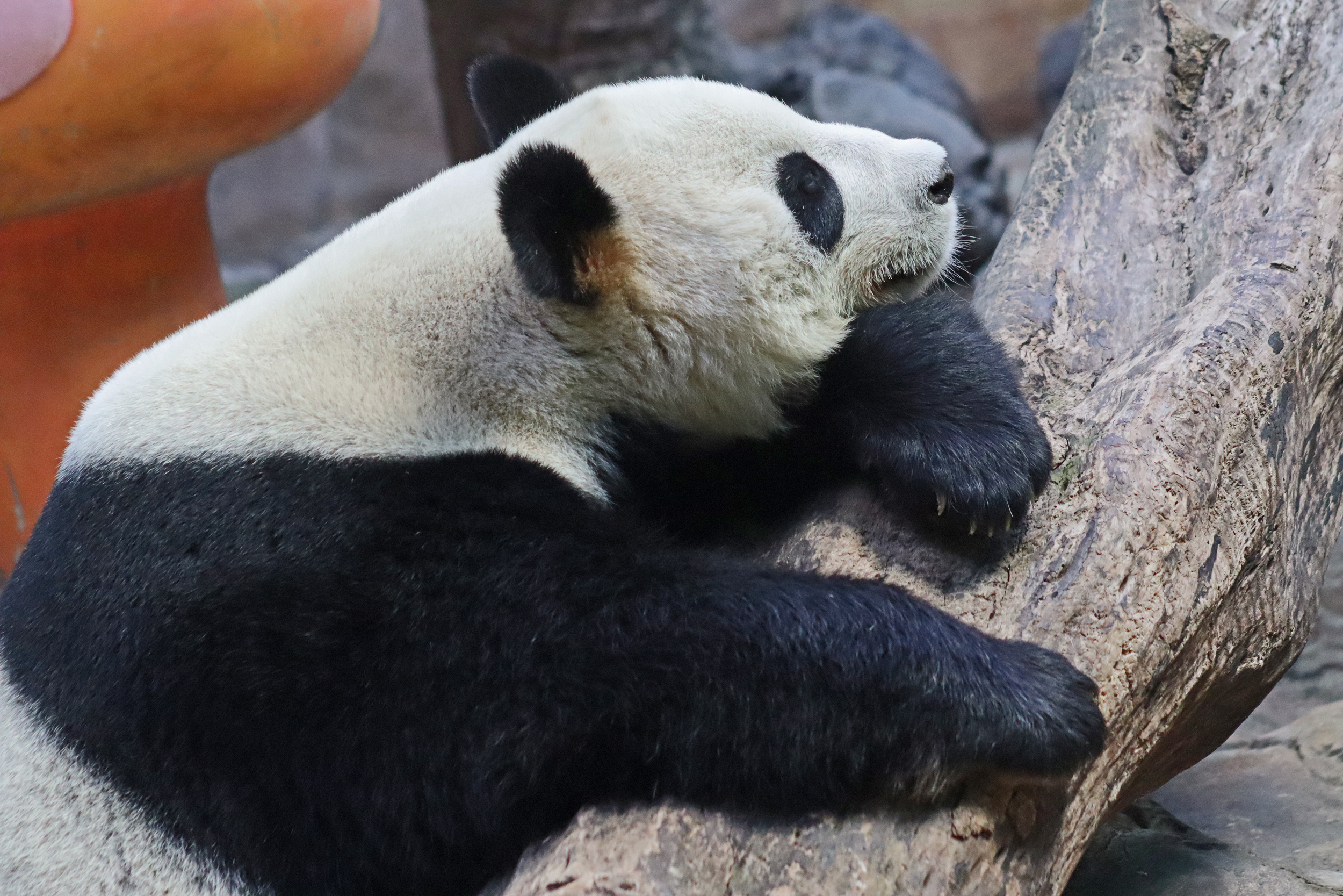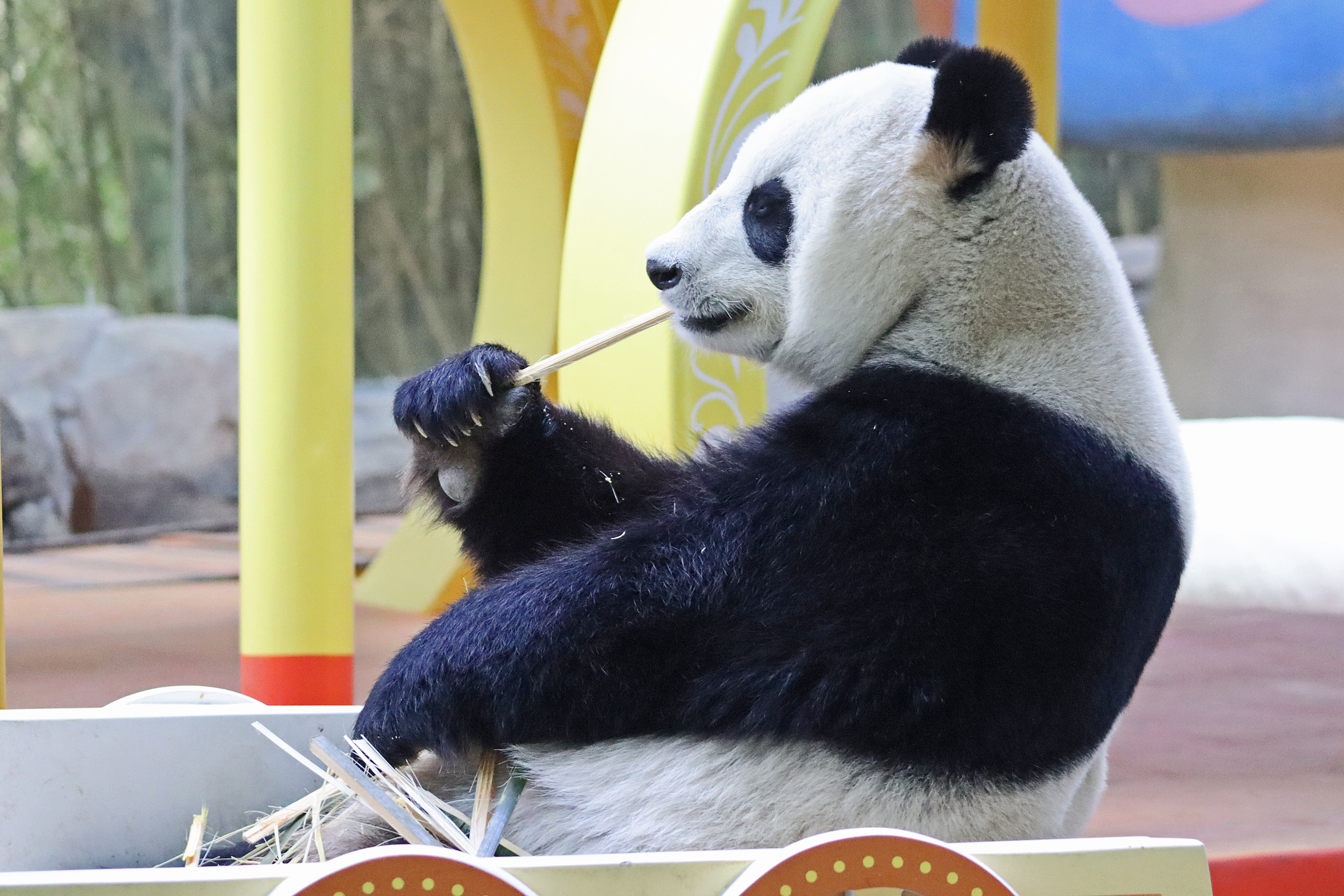 And the third panda for this post, and actually the last one I saw in this panda section was Mei Qing 梅清, a 22.5 year old female. She was born in Wolong and spent the first 10 years of her life around the Wolong and Ya’an bases before moving to Chimelong in 2012 and has been here ever since. And let me say, she looks great for her age, she didn’t seem in her 20’s at all when I saw her! So she was in the indoor yard with the train which was very exciting for me to finally see, but I think it looks like her and the panda in the outdoor yard next door alternate between yards based on the signs that were up as I saw more information about her at the outdoor yard. When I first got to her space I was so excited to see that she was sitting in the train carriage, honestly made my day! I had hoped to see the train going around the track, but sadly didn’t see it (something for next time^), but she was super cute sitting there and enjoying some bamboo! I came round by her yard several times, so saw her in the train, taking a snooze against a tree, relaxing ontop of her ice block, climbing, and eating more bamboo – she really was quite active, so I was super lucky with this! While she was very popular, I was able to get good spaces to get photos of her – this yard was completely glass-free so the viewing was excellent, I just found it was quite dark especially as it was so bright outside. Her signs say that she has quite a lazy personality and that she likes to eat slowly, as well as saying that her four children are very handsome and beautiful (I think I can agree to that =D).