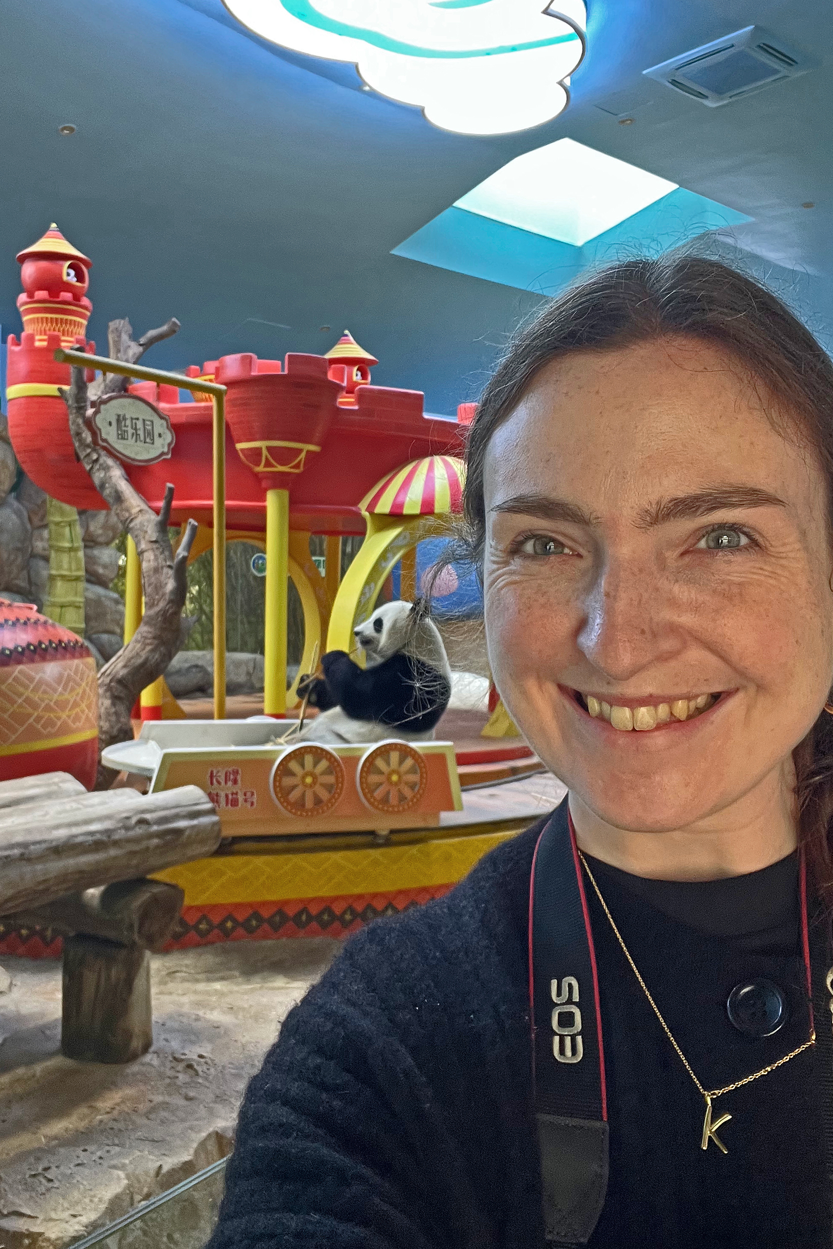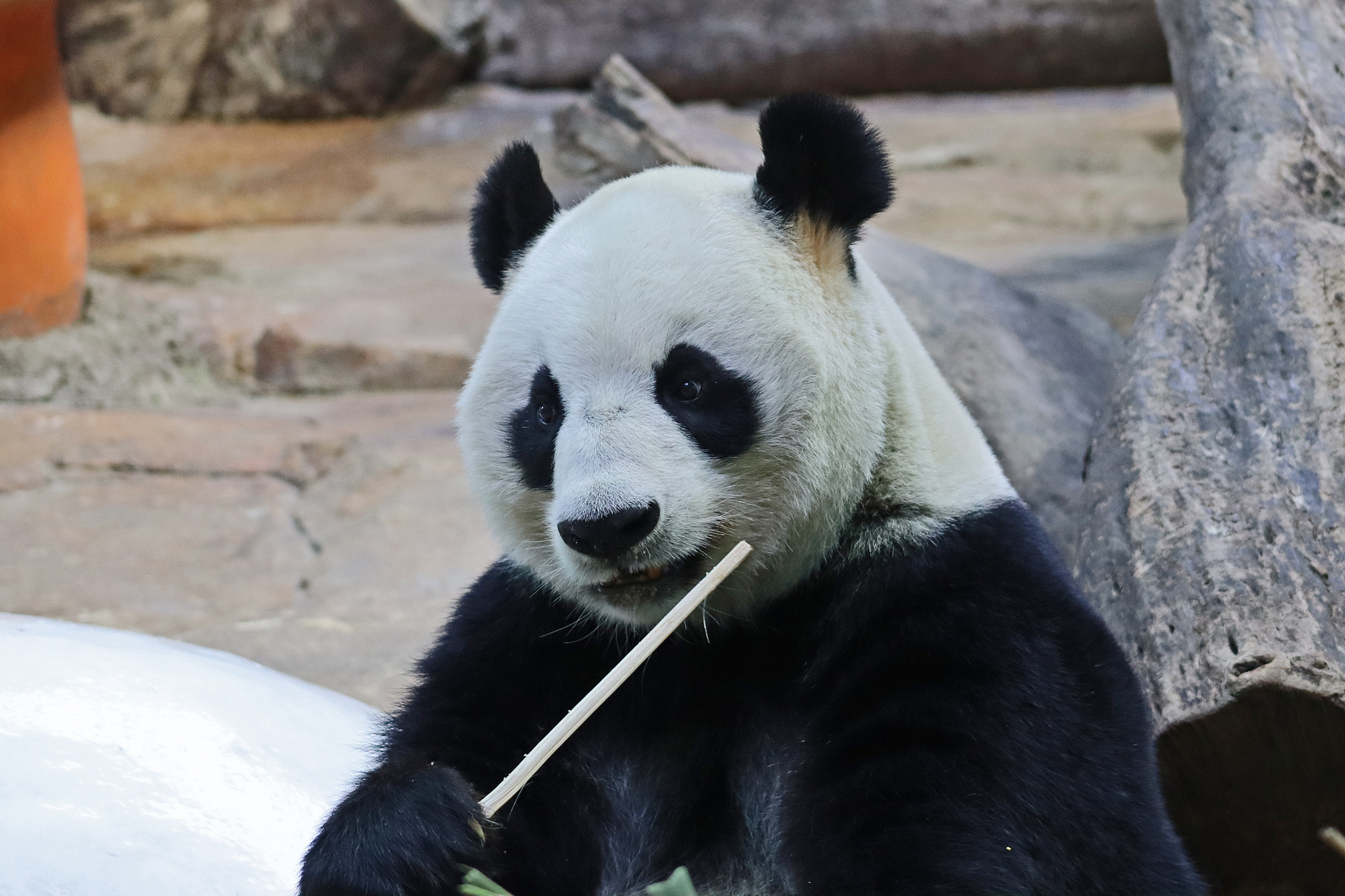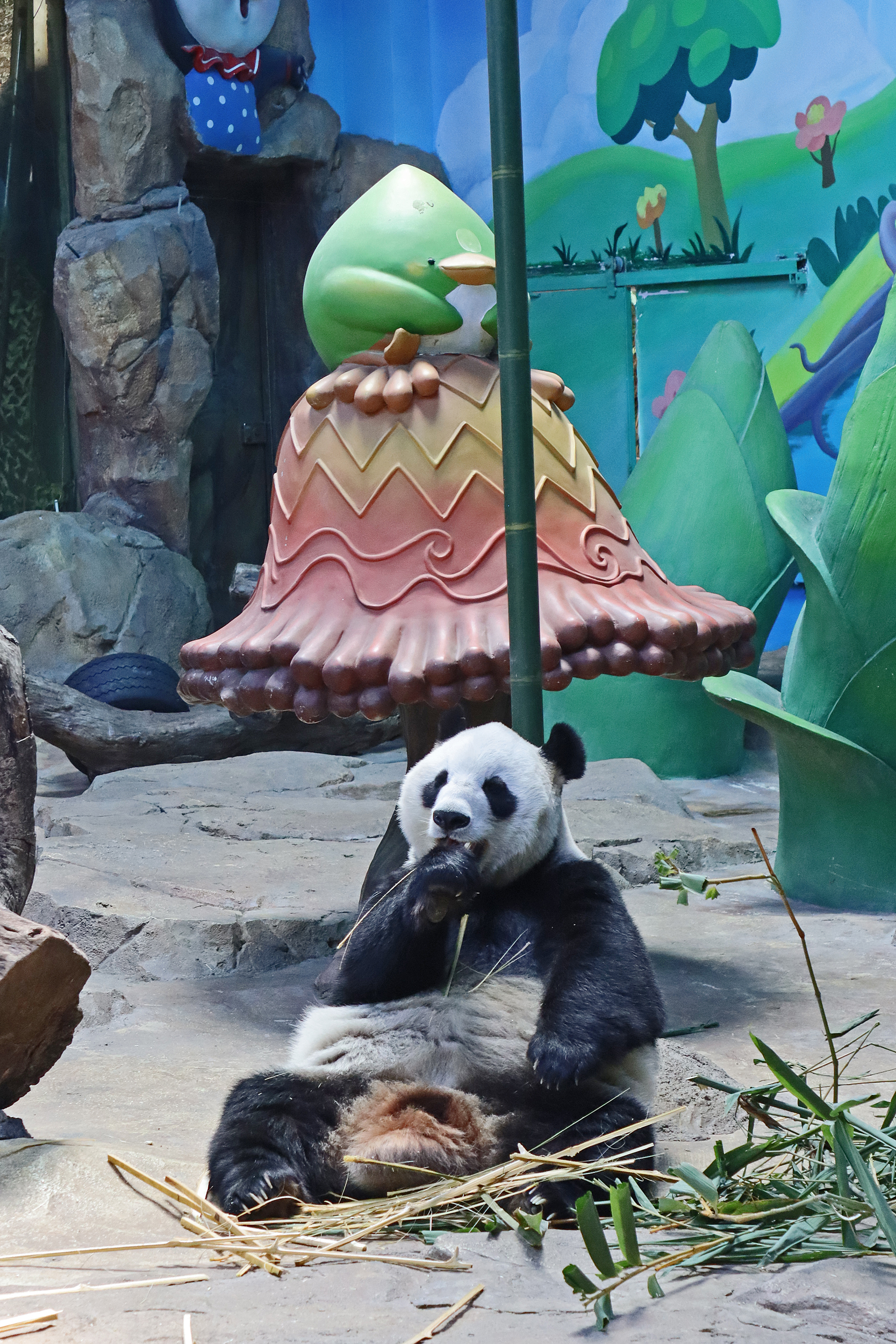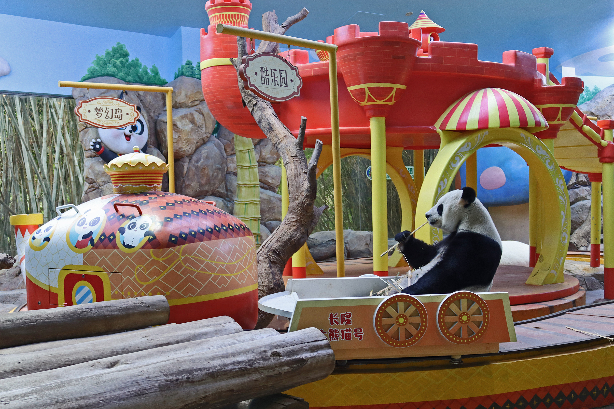 And the third panda for this post, and actually the last one I saw in this panda section was Mei Qing 梅清, a 22.5 year old female. She was born in Wolong and spent the first 10 years of her life around the Wolong and Ya’an bases before moving to Chimelong in 2012 and has been here ever since. And let me say, she looks great for her age, she didn’t seem in her 20’s at all when I saw her! So she was in the indoor yard with the train which was very exciting for me to finally see, but I think it looks like her and the panda in the outdoor yard next door alternate between yards based on the signs that were up as I saw more information about her at the outdoor yard. When I first got to her space I was so excited to see that she was sitting in the train carriage, honestly made my day! I had hoped to see the train going around the track, but sadly didn’t see it (something for next time^), but she was super cute sitting there and enjoying some bamboo! I came round by her yard several times, so saw her in the train, taking a snooze against a tree, relaxing ontop of her ice block, climbing, and eating more bamboo – she really was quite active, so I was super lucky with this! While she was very popular, I was able to get good spaces to get photos of her – this yard was completely glass-free so the viewing was excellent, I just found it was quite dark especially as it was so bright outside. Her signs say that she has quite a lazy personality and that she likes to eat slowly, as well as saying that her four children are very handsome and beautiful (I think I can agree to that =D).