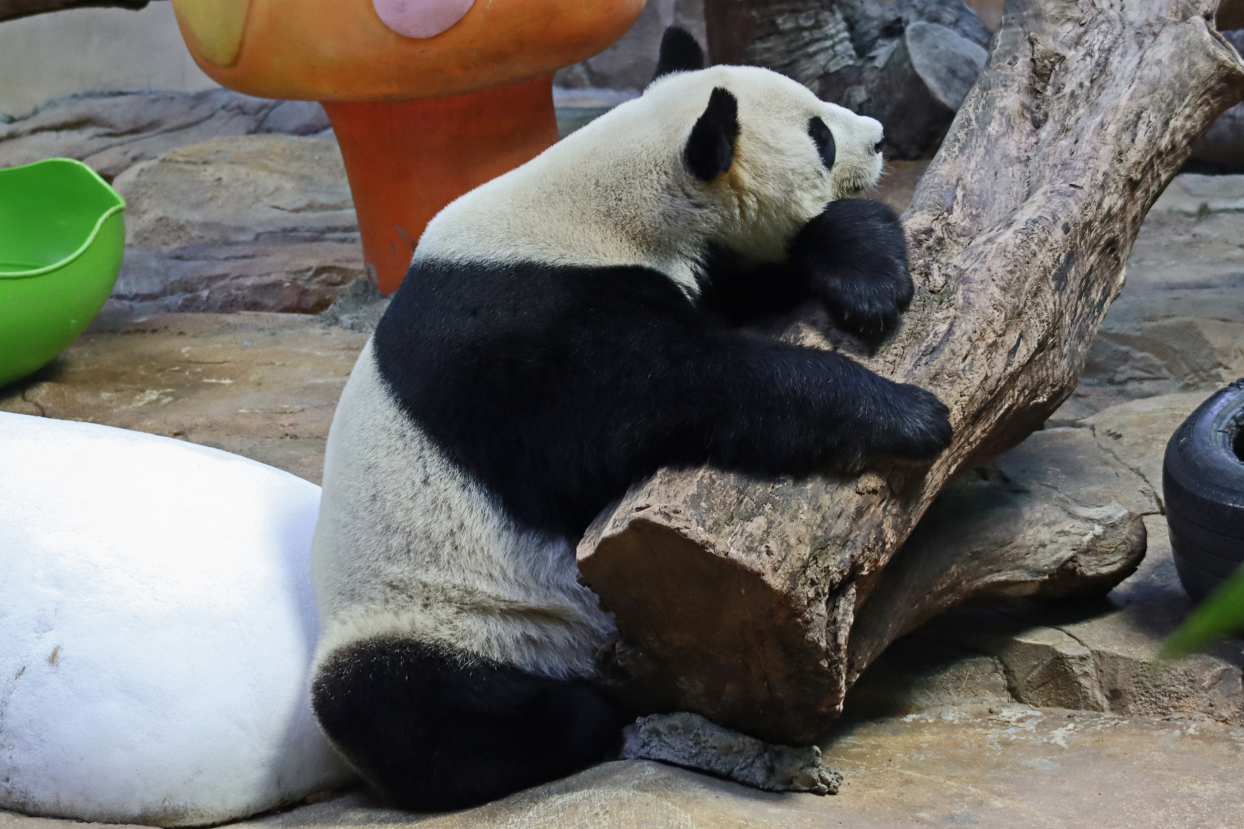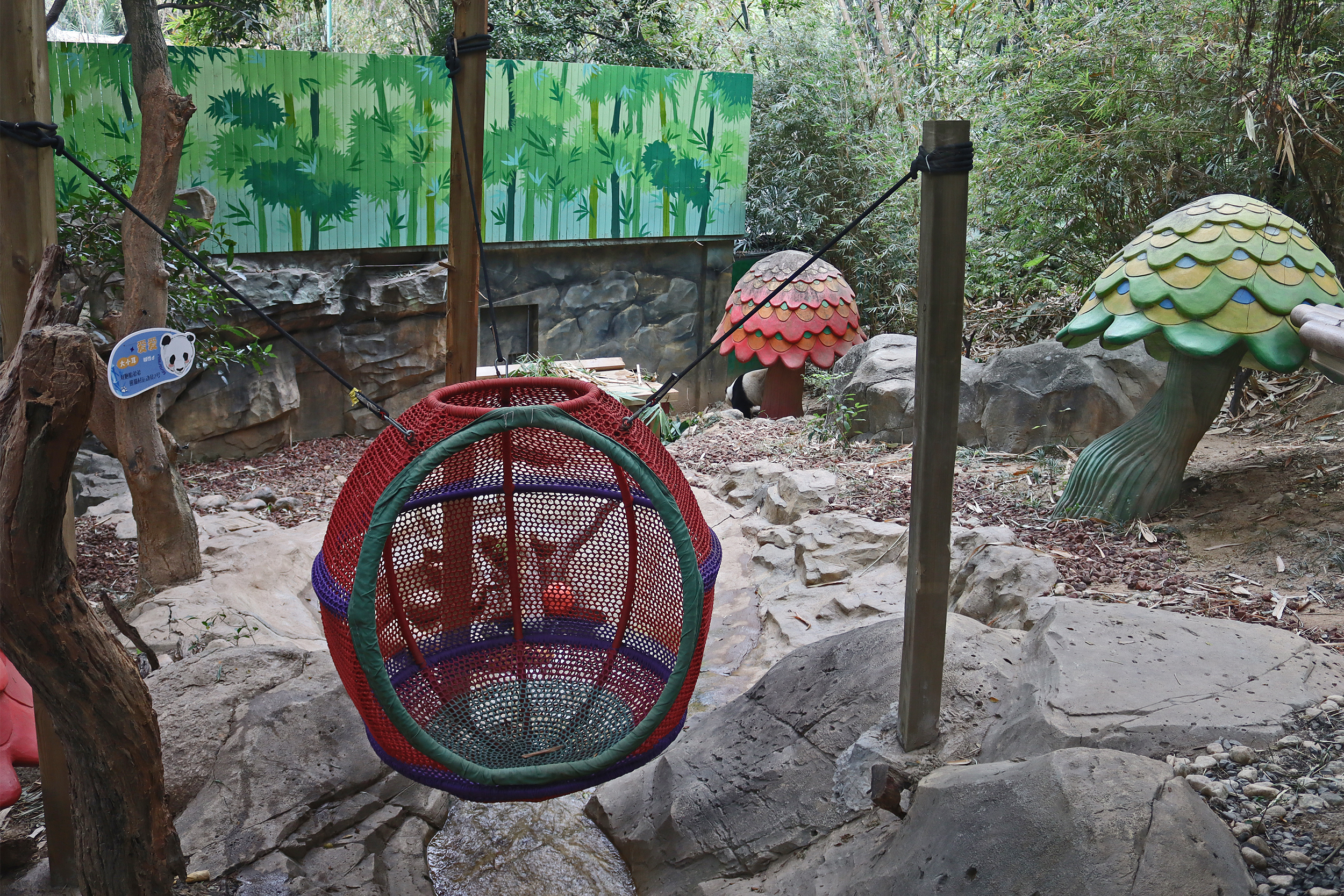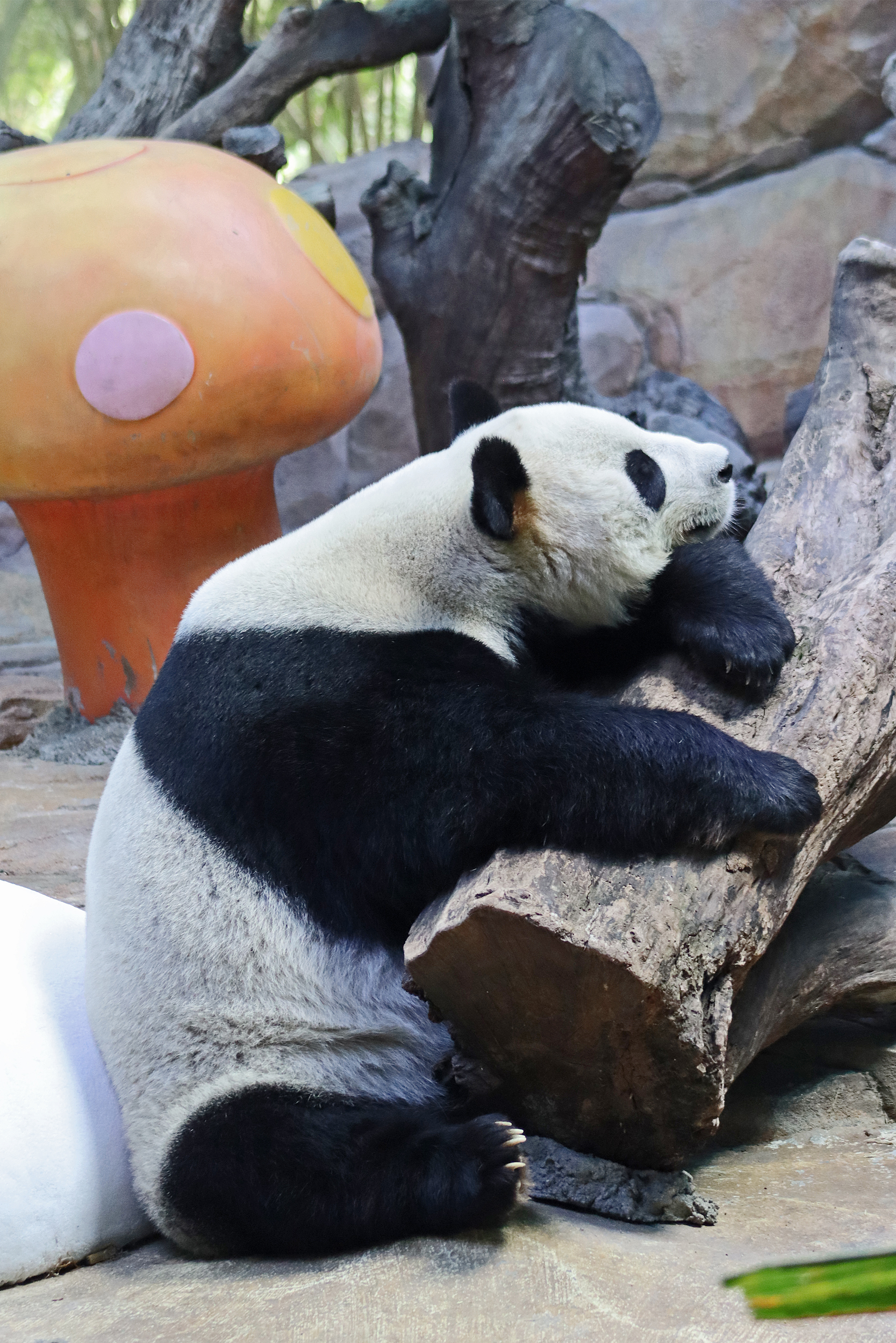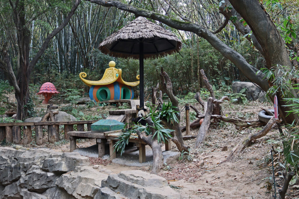 Directly across from Yue Yue is Ai Ai 爱爱, an 8.5 year old male – he is one of the twins born to Mei Qing in 2016, so he is half sibling with Long Long. I found this yard really difficult to view because it’s the lower half of the hillside, so you are at the top looking down the hill. There were a lot of climbing and enrichment items and giant toadstools, which made viewing quite tricky and Ai Ai seemed to prefer a quieter more peaceful time. He spent most of the time at the far end of the yard or sleeping behind a tree so I really couldn’t get a good view of him at all.