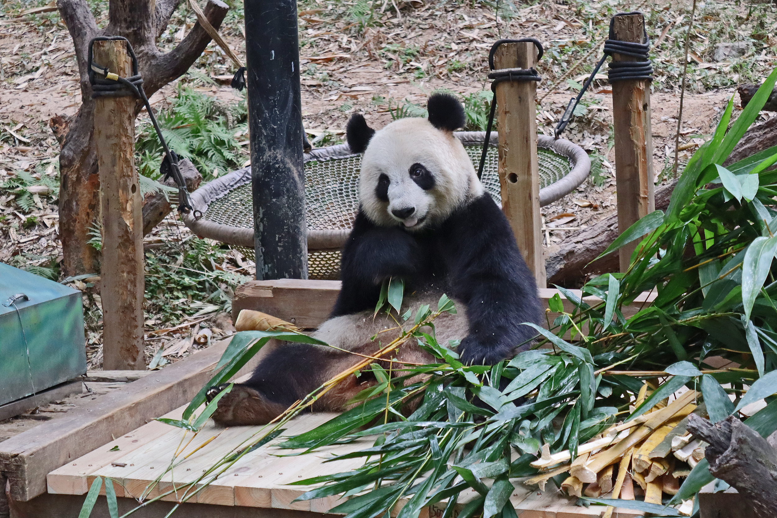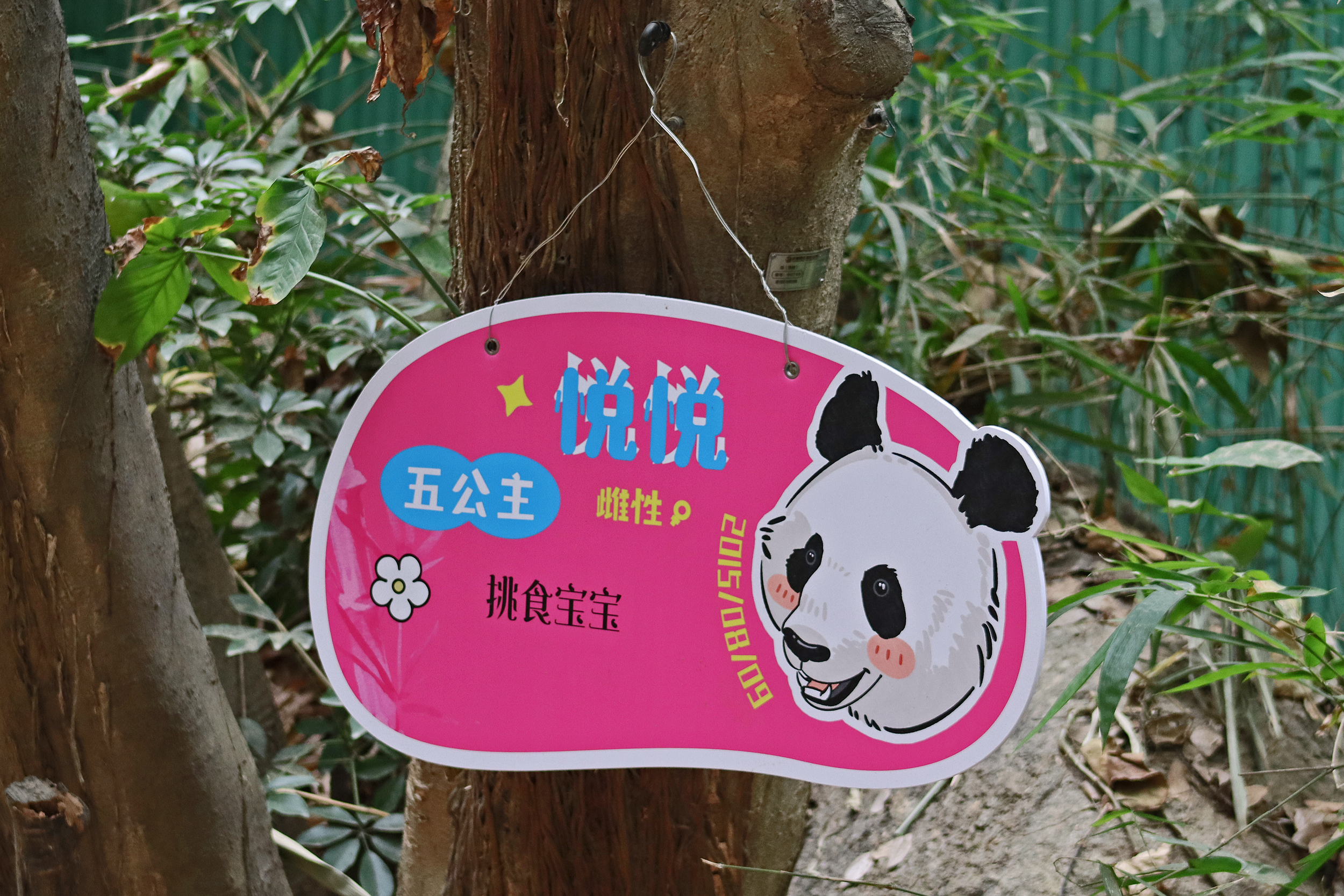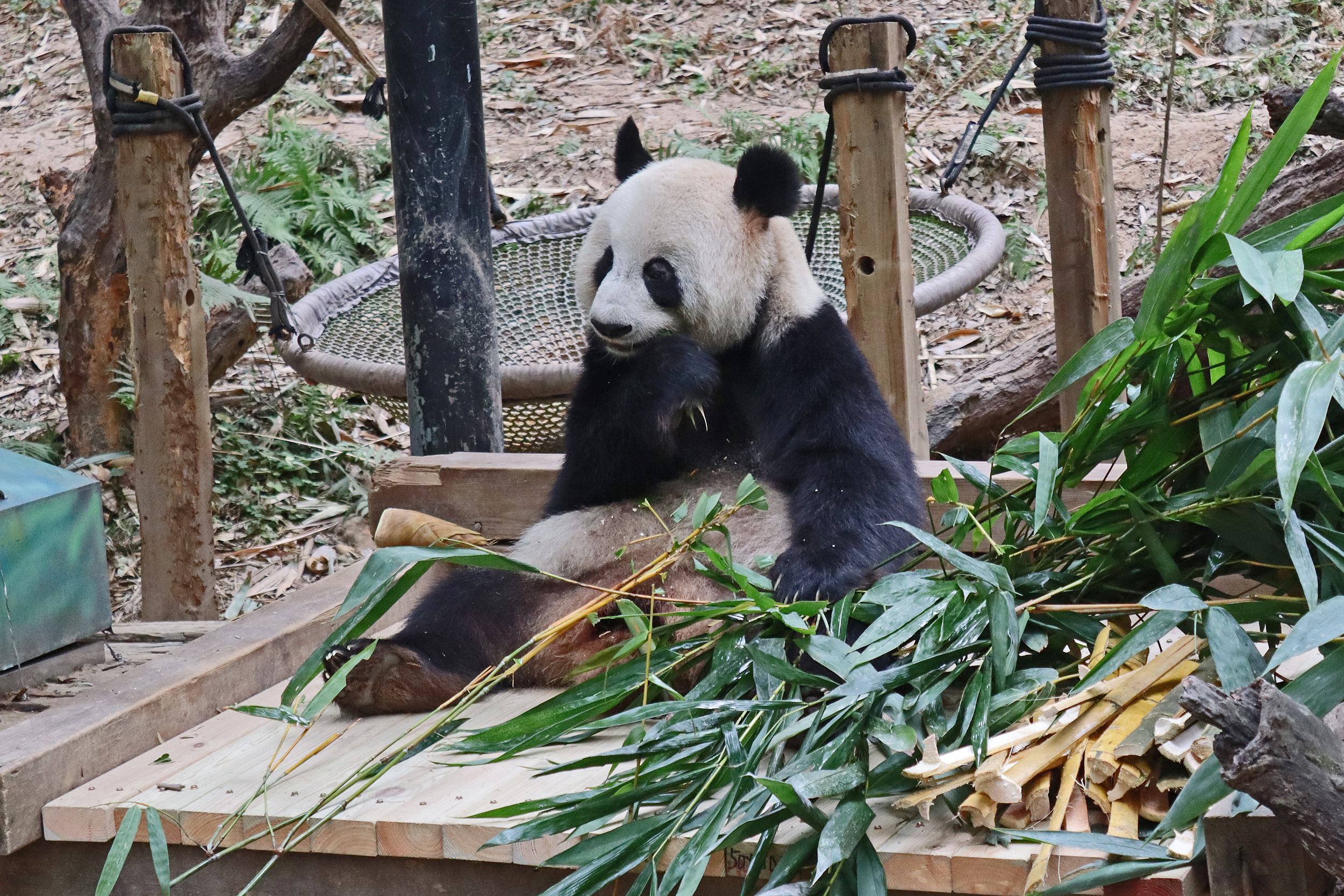 In the third yard I saw Yue Yue 悦悦 – a 9.5 year old female panda. After Long Long‘s yard, this was the next on on the right hand side. This yard is directly opposite a second one, with the two built on a hillside, and the walkway for visitors goes through the middle, so this is the upper half of the hill and the other is the lower half. There is both clear viewing and viewing through glass here – I found the glass quite mucky and difficult to see through, so I only really took photos at the glass-free section, but I did like the overall design for the yards and the viewing. This yard had lots of wooden climbing and enrichment, with the big platform in the centre being a favourite eating spot, but I was happy to also see the swinging hammock getting a go too, this is cute and I like these (or similar) in panda yards. Yue Yue was the only panda born in 2015 here in Chimelong. Her sign doesn’t provide much information, that she is the 5th princess (so I’m assuming, 5th panda born in Chimelong after Long Long and the triplets) and that she is a picky eater XD