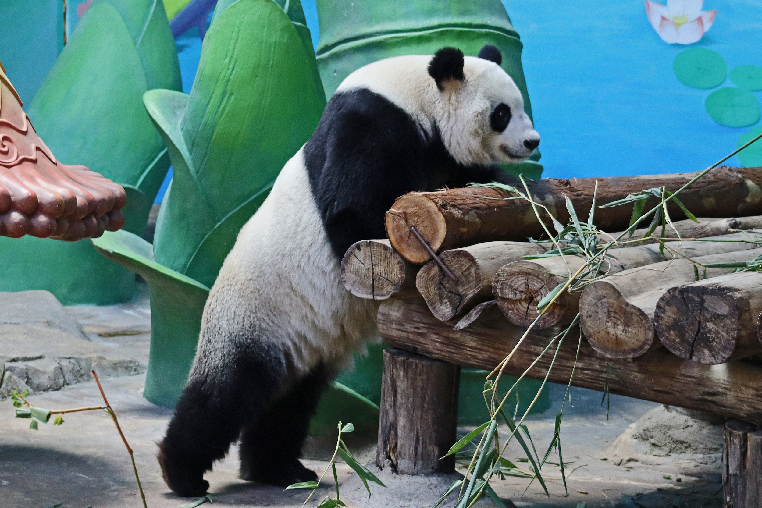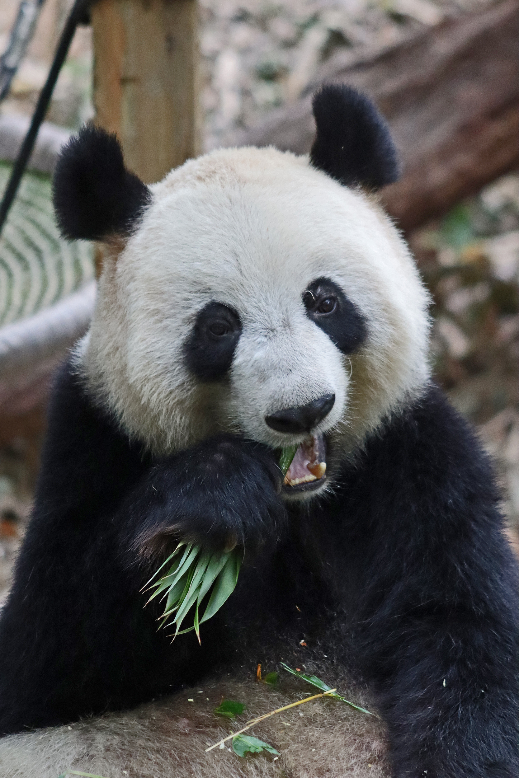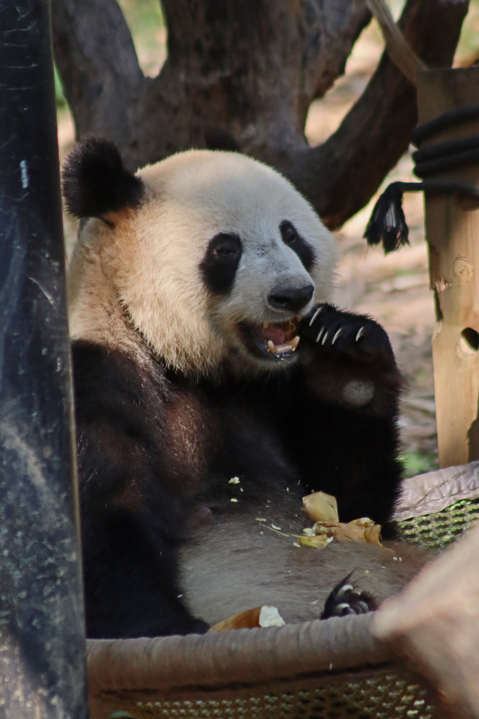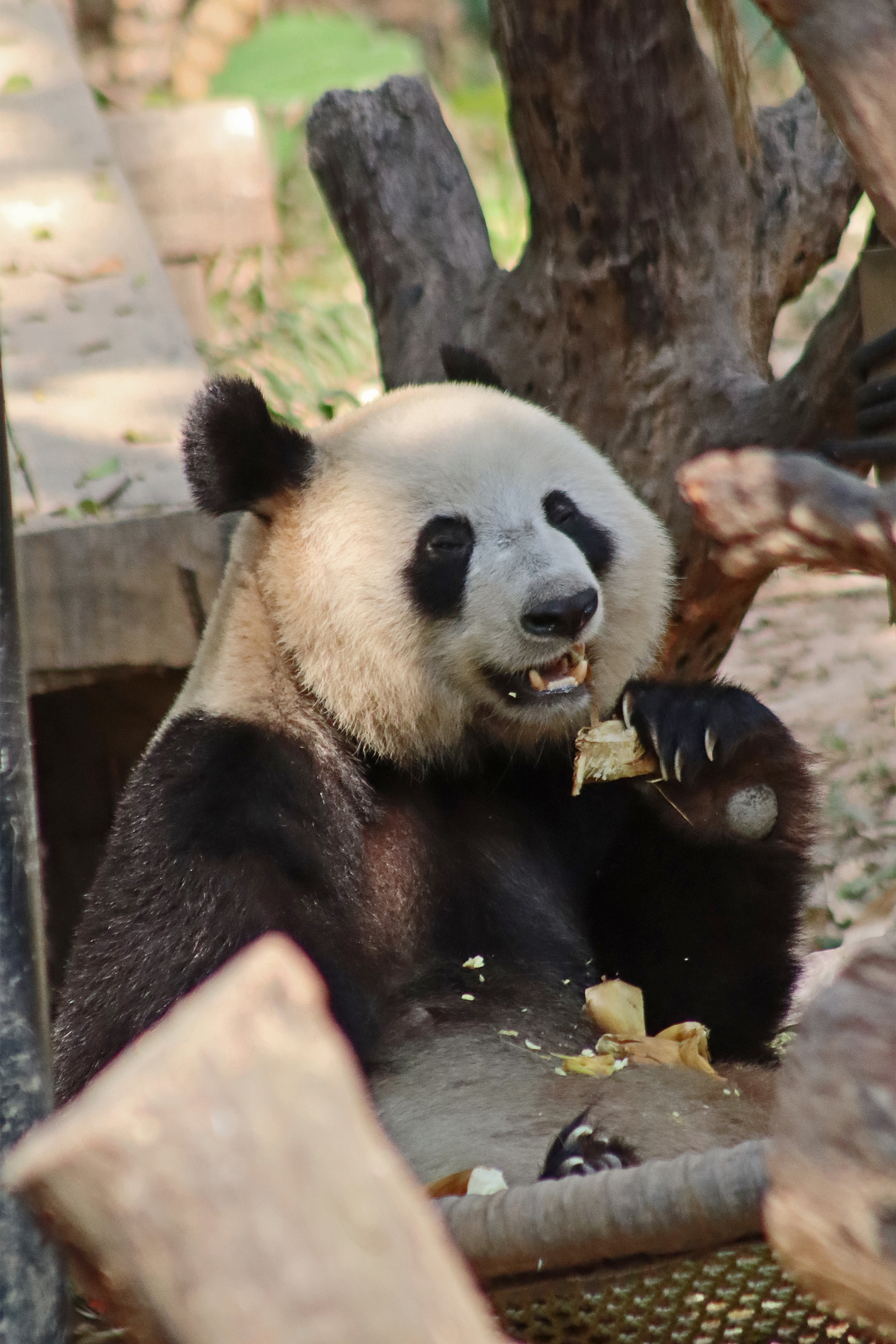 In the third yard I saw Yue Yue 悦悦 – a 9.5 year old female panda. After Long Long‘s yard, this was the next on on the right hand side. This yard is directly opposite a second one, with the two built on a hillside, and the walkway for visitors goes through the middle, so this is the upper half of the hill and the other is the lower half. There is both clear viewing and viewing through glass here – I found the glass quite mucky and difficult to see through, so I only really took photos at the glass-free section, but I did like the overall design for the yards and the viewing. This yard had lots of wooden climbing and enrichment, with the big platform in the centre being a favourite eating spot, but I was happy to also see the swinging hammock getting a go too, this is cute and I like these (or similar) in panda yards. Yue Yue was the only panda born in 2015 here in Chimelong. Her sign doesn’t provide much information, that she is the 5th princess (so I’m assuming, 5th panda born in Chimelong after Long Long and the triplets) and that she is a picky eater XD